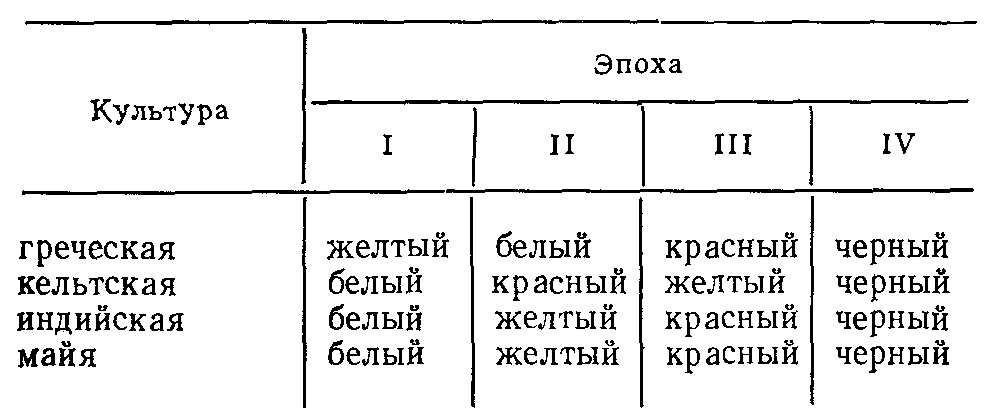 Еще более поразительную аналогию можно усмотреть в картине мироздания. Индо-тибет-ские четыре страны света, охраняемые лока-палами, и соответствующие им цвета имеют несомненного двойника в Мезоамерике. Много общего и в космогонических мифах. Индийская махаюга делится, как известно, на четыре юги, или эпохи, – Крита, Трета, Двапара и Кали, которым тоже соответствует определенный цвет. Упоминание о четырех эпохах, исчисляющих время существования человеческого рода, мы находим в греческой мифологии, в преданиях кельтов и майя. Вот как выглядит распределение цветов по эпохам в мифологии различных культур: