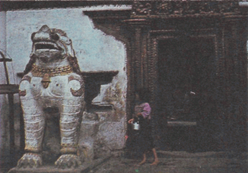 Над дверями, на которых обычно рисуются устрашающие охранители или маски чудовищ, сверкает восьмирадиусный круг с двумя оленями по бокам. Четыре локапалы – хранители стран света – стерегут преддверие святилища. Космическая символика, пронизывающая все индо-буддийские вероучения. Красные четырехугольные колонны обычно расписаны золотыми фантастическими фигурами: драконами, птицами-гарудами, змеями-нага-ми. Так посланцы Вишну и Шивы проникли в оплоты буддизма.