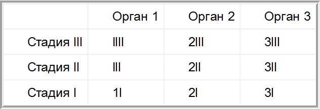 Восходящая диагональ, обозначенная жирными линиями, обозначает как последовательность стадий (I, II, III), так и развитие составляющих частей (органов) (1, 2, 3); другими словами, в диаграмме схематически представлен прогресс в дифференциации органов на протяжении определенного времени. Это значит, что каждый орган (скажем, 2I) существует (нижняя ячейка на диагонали) в некой форме до того, как настает «решающее» или критическое время для его нормального появления (2II), и при этом остается системно связанным со всеми другими органами (1 и 3), так что весь ансамбль зависит от надлежащего развития каждого из элементов в предписанной последовательности.