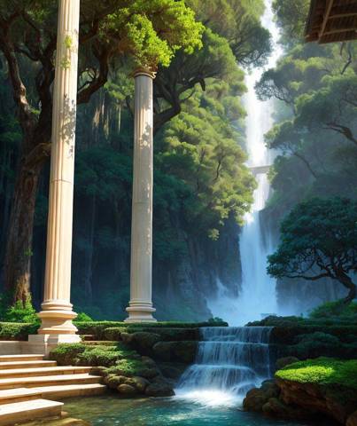 Мы обошли старый храм с восточной стороны, поднялись выше по дорожке, едва заметной в траве и оказались возле колоннады, за которой открывался вид на небольшое озеро чистейшей бирюзовой воды. Над озерцом поднимался пар, и над водопадом, питавшим его, тоже висело облако пара. Ниже колоннады начинались ступени, сходящие к нескольким бассейнам и широкой мраморной купальне.