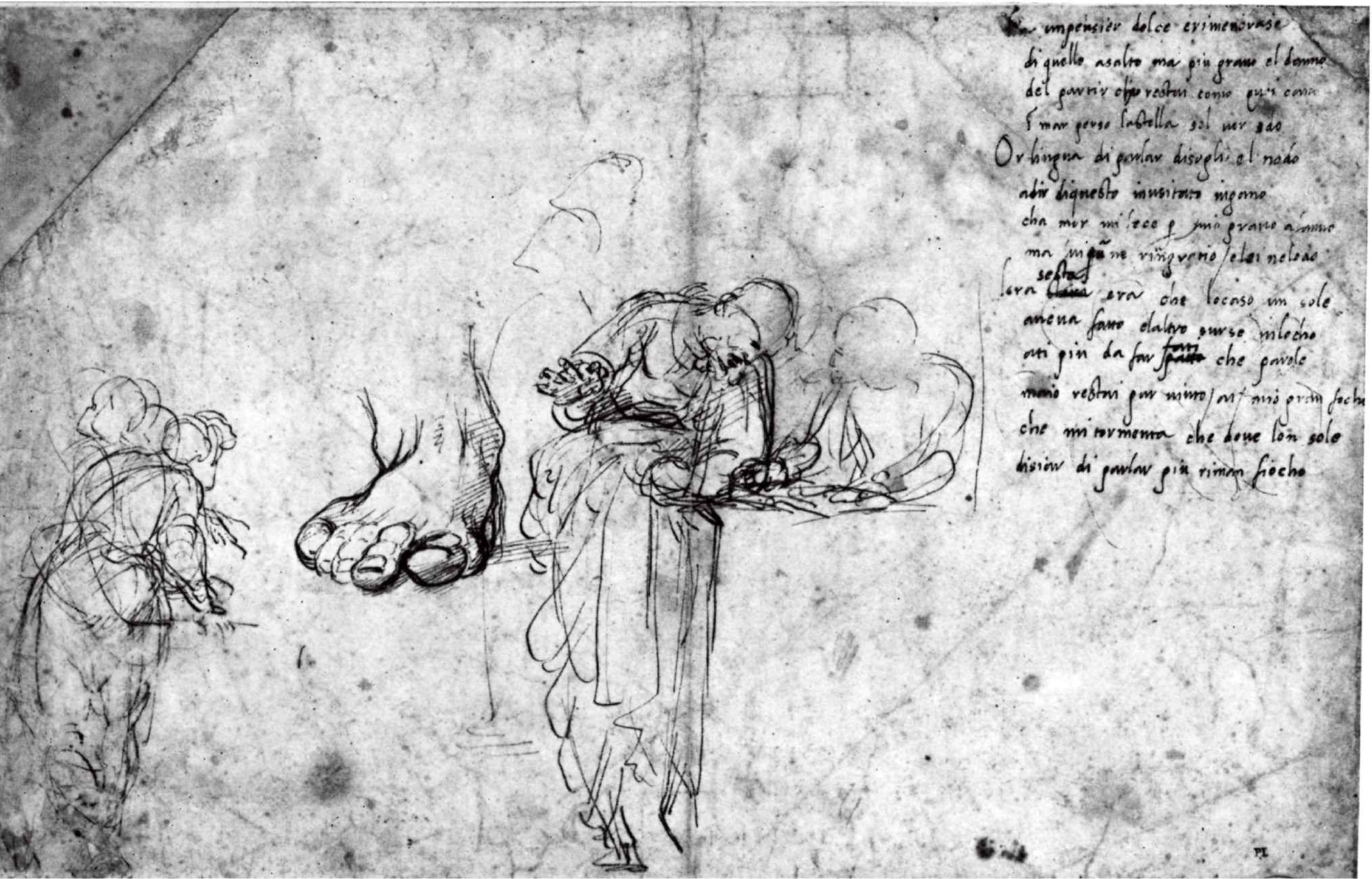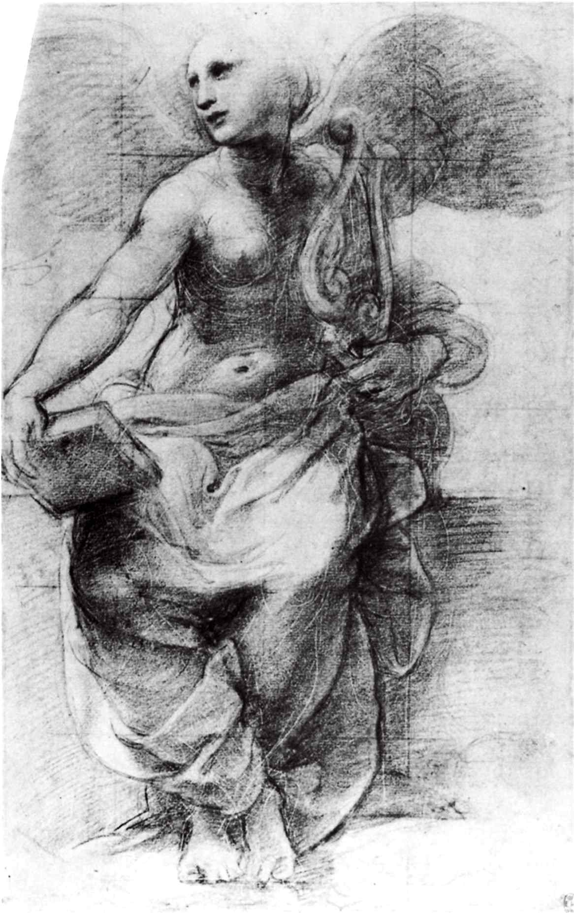 Разрыв был закрыт, но осталась еще одна композиционная нестыковка – там, где движение вперед натыкается на сидящие фигуры в центре. Вновь Рафаэлю требовалась фигура, которая приняла бы движение и передала вперед – развернутая фигура. В Британском Музее есть быстрый перьевой рисунок с фрагментом сонета, наброском двух спорящих «еретиков», ступней и графической стенограммой рафаэлевской мысли – мы видим, как он разворачивает фигуру в пространстве. На наших глазах замысел обретает плоть: сперва, похоже, фигура принадлежит к группе, подобной читающим или смотрящим в «Афинской школе», но вот уже в оксфордском рисунке, содержащем также идеи для «Парнаса» решение почти достигнуто, остается лишь одеть фигуру величественной драпировкой, которая на рисунке углем придаст ей художественно необходимый вес или gravitas. Разумеется, это не исключает, что в некой более общей системе мыслей фигура получила имя, но, судя по всему, что мы видели, это могло произойти только задним числом.