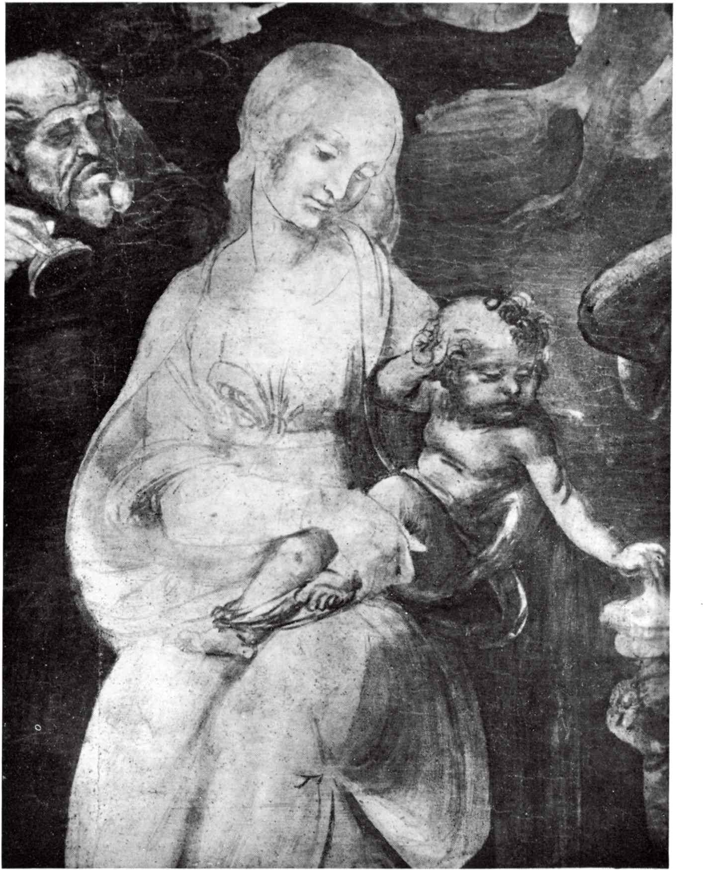 Однако, глядя на блистательный виндзорский набросок, в котором Рафаэль, похоже, запечатлел свой первый законченный план, мы видим еще более странное заимствование. Группа на земле, которую связывает с сидящими на облаках прелестная фигура (она указует на небо жестом, характерным для традиционных персонификаций Надежды), почти воспроизводит левую часть незаконченного «Поклонения волхвов» Леонардо. Фигура стоящего старца, закутанного в плащ и погруженного в свои мысли, играет у Рафаэля ту же композиционную роль, что и у Леонардо – придает устойчивость группе, остальные члены которой наклонены и устремлены вперед.