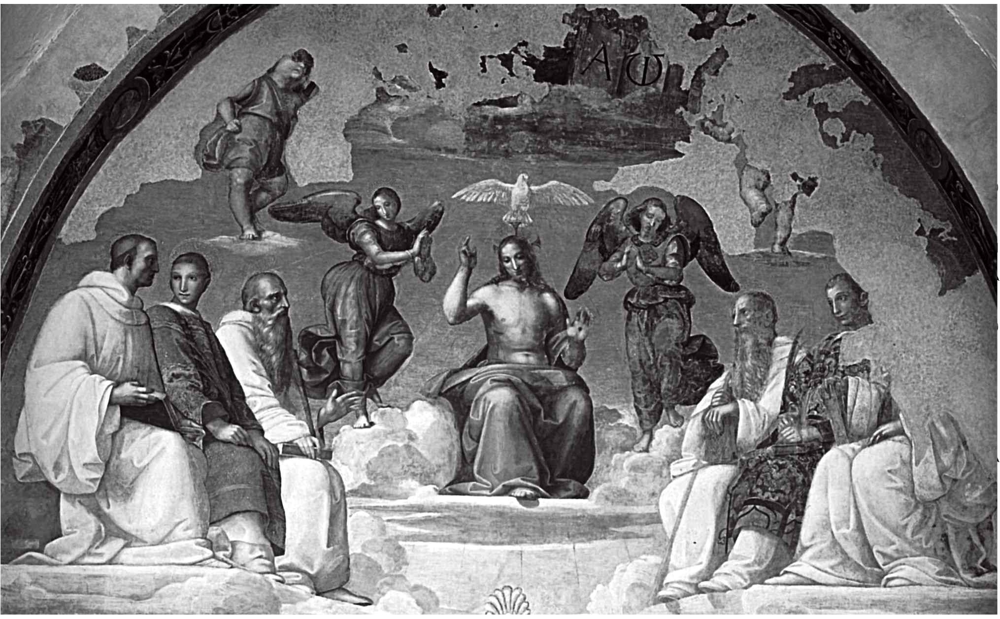 Наиболее полна эта летопись для собрания фигур под Divinarium re-rum notitia – так называемого «Спора о причастии». Его общий замысел на удивление близок к другой работе Перуджино, чья роспись Камбьо так явно повлияла на общий план Станцы. Композиция эта расположена на потолке покоя, непосредственно прилегающего к Станце делла Сеньятура – сегодняшней Станце делль Инчендио Рафаэля. Неизвестно, когда Перуджино ее расписывал, но, вероятно, это было в 1508, как раз перед тем, как начались работы в Станце делла Сеньятура. Как и в «Споре», мы видим сошествие Святого Духа в виде голубя, который распластал крылья под фигурой благословляющего Христа. Основная концепция двух работ настолько схожа, что поневоле задумаешься – нет ли тут еще и исторической связи.