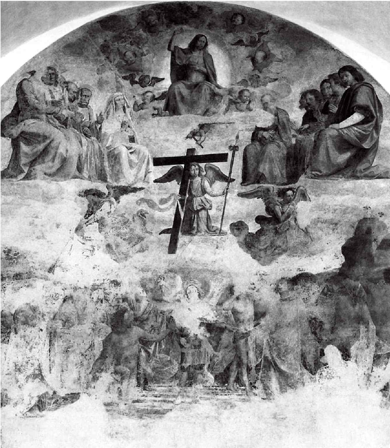 Не могло ли быть так, что двадцатипятилетнего Рафаэля вызвали в Рим помогать стареющему учителю, который только что завершил роспись Камбьо в Перудже, и лишь потом Юлий II (возможно, по совету Браманте) решил поручить юному гению соседний покой. Возможно, Рафаэль, планируя, как организовать стену, позаимствовал формулу из другой их общей с Перуджино работы – «Троицы» Сан Северо, где святые полукругом обступили восседающего на облаках Христа. Похоже, что Рафаэль решил составить верхнюю половину фрески по образу Страшного Суда, с Христом в центре, ходатаями и судьями по бокам. Предполагается, что ее источником стал «Страшный Суд» фра Бартоломео, художника, у которого Рафаэль так многому научился.