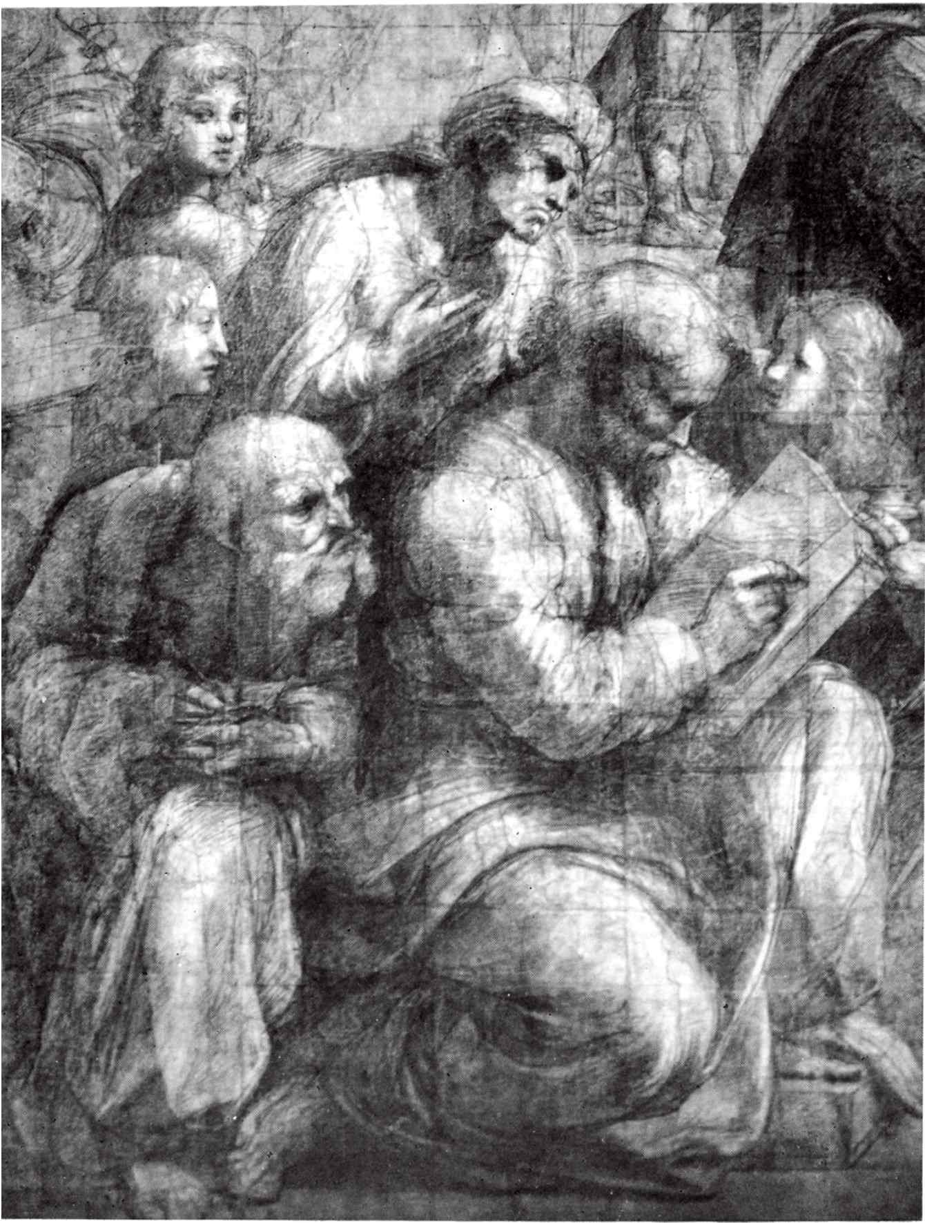 Однако вышло так, что дивный замысел Леонардо оказался недостаточным для длинной стены, которую предстояло заполнить Рафаэлю, и он оставил первоначальную мысль соединить фра Бартоломео и Леонардо. Однако не бросать же было явно понравившуюся группу, и Рафаэль перенес ее на противоположную стену, превратив одного из участников в пишущего мудреца, которому остальные заглядывают через плечо. Картон к «Афинской школе» доказывает это заимствование; мы видим, что Рафаэль без стеснения копировал даже отдельные типы, если те ему подходили.