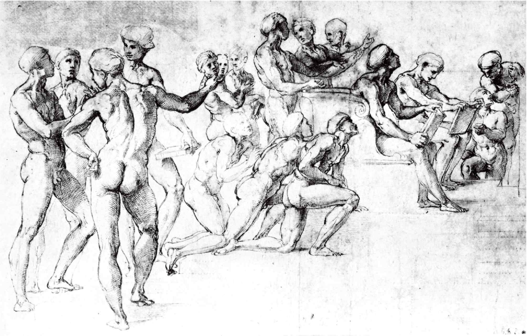 Это – летопись работы, оставленная самим художником – множество рисунков к Станце, которые О. Фишель скрупулезно разбирает в своем монументальном труде «Рисунки Рафаэля».[299] Хотя к его анализу мало что можно прибавить, стоит еще раз перебрать эти свидетельства, которые никогда не перестанут изумлять всех, кто изучает творческий процесс.[300] Мы увидим, что не только весь замысел вырос из переработки известных циклов, но и вся совершенная симфония форм своей целостностью и выразительностью во многом обязана последовательному использованию существующих композиций, которые Рафаэль, преобразив, включил в свой шедевр.
