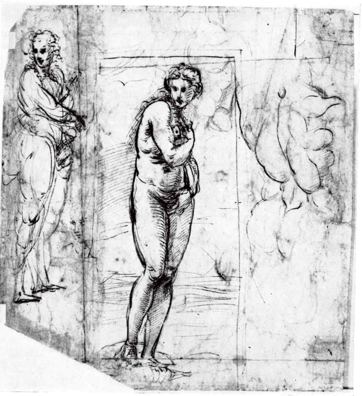 И у Боттичелли, и на франкфуртском рисунке Рафаэля есть разрыв между движением к центру и обратным движением к периферии. В завершенной фреске этот разрыв блестяще ликвидирует развернутая в пол-оборота фигура, которая связывает группы. Вновь можно лишь восхититься экономией средств – эту фигуру Рафаэль взял с первого виндзорского рисунка, где она связывает верхний и нижний ярусы. Можно проследить, как тщательно Рафаэль приспосабливал ее к новому назначению. Есть наброски (Лиль) в которых он прорабатывает степень разворота, однако удивительнее всего рисунок из Уффици, на котором видно, как же Рафаэль умел использовать традицию – здесь образ античной Венеры помог разобрать столь простую с виду и столь благородную позу.