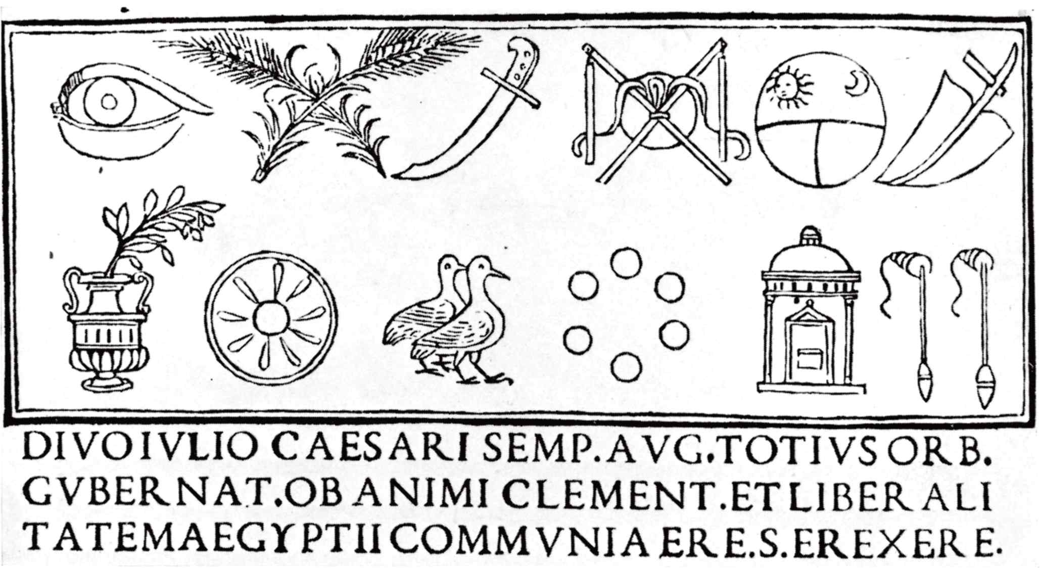 Вазари писал об этом шестьдесят лет спустя и, похоже, упустил коекакие тонкости. Самая претенциозная иероглифическая надпись, «расшифрованная» в «Гипнеротомахии Полифила»[308] напоминает задуманный Браманте фриз и гласит: «Divo Julio Caesari semper Augusto totius orbis gubernatori ob anim clementiam et liberalitem Aegyptii communi aere s. erexere». (Божественному Юлию Цезарю, присно августу, правителю всего мира, за его милосердие и доброту, египтяне воздвигли меня на общественный счет.) Глаз означает divus, пшеничные колосья – Julius, меч – Caeser, круг – semper, цепы – Augusto и т. д.[309] Сходство двух надписей вряд ли случайно.[310]
