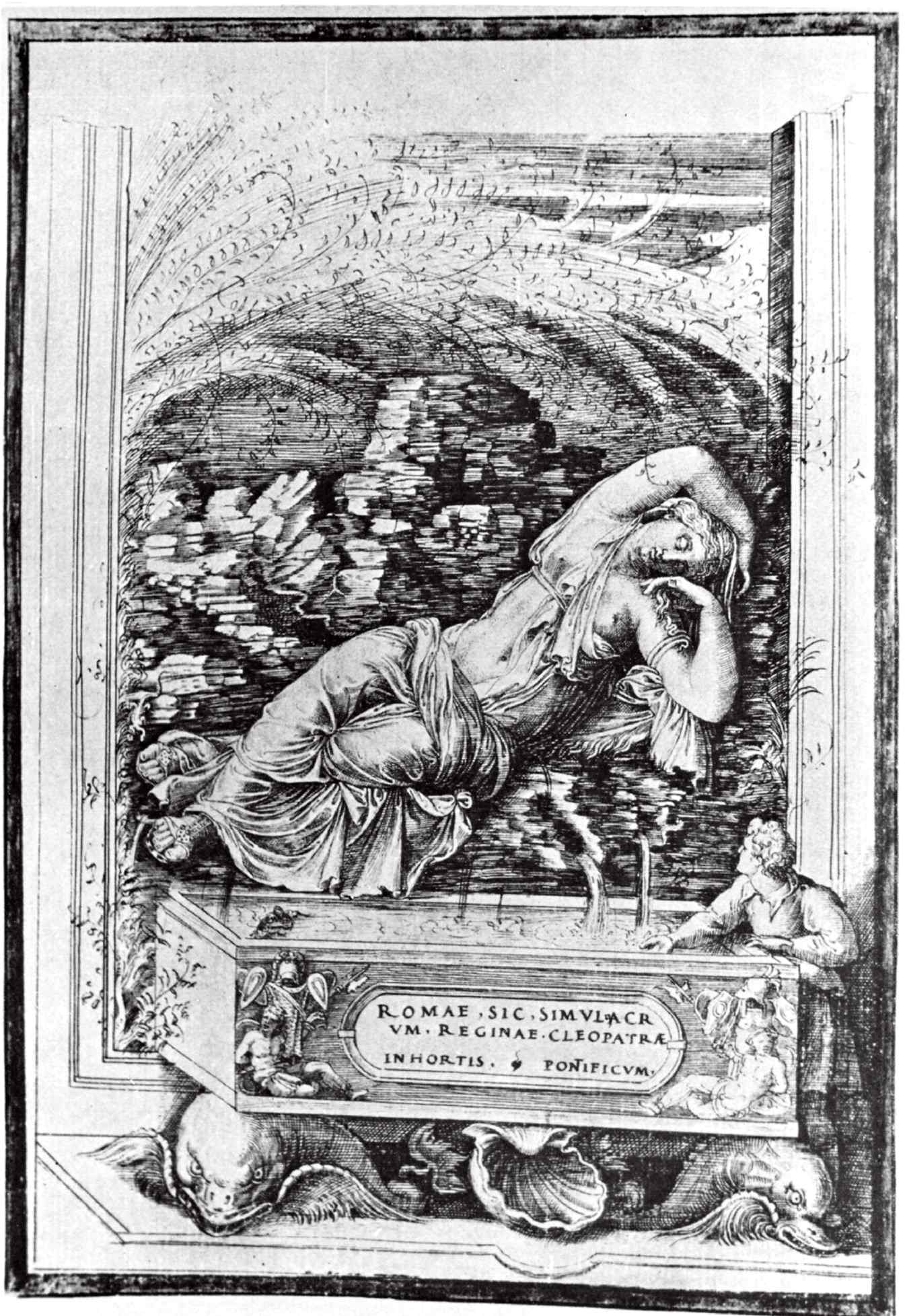 Интересней вопрос об общем расположении группы, составлявшей фонтан. Описание Пико сильно напоминает отрывок из «Гипнеротомахии», где Колонна описывает «Прекраснейшую спящую нимфу, уютно лежащую на расстеленной ткани… рука откинута назад, свободная ладонь подпирает щеку… Из сосков ее груди (с виду почти девических) вытекает струя чистейшей воды из правого и теплой влаги из левого. Этот двойной поток водопадом сбегает в порфировую чашу».[333] Однако, если Пико вспомнил про «древние акведуки», разве не мог Браманте руководствоваться этим же описанием?