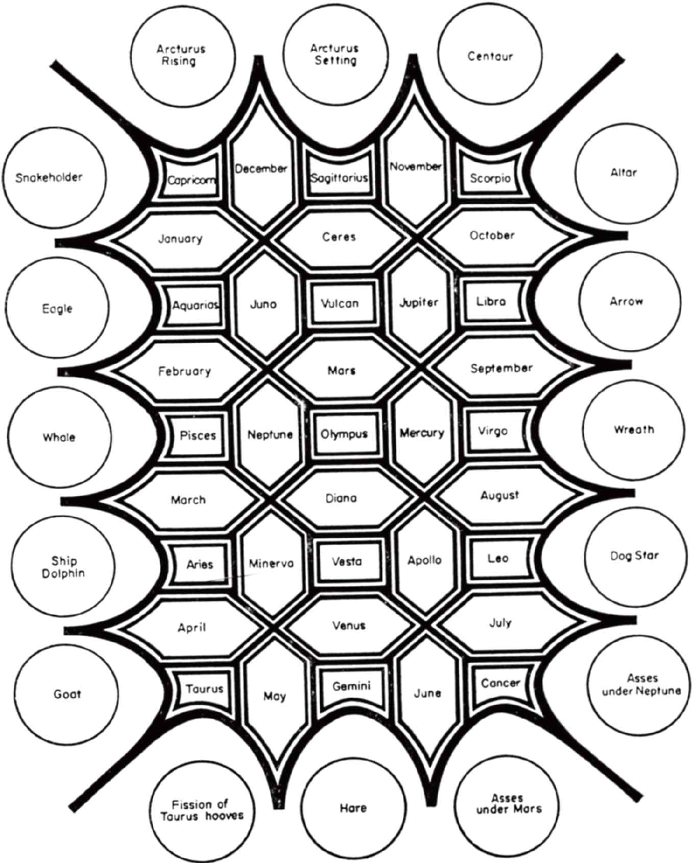 Олимпийцы втиснуты таким странным образом, потому что двенадцать сплюснутых шестиугольников, непосредственно прилегающих к знакам зодиака, оставлены двенадцати месяцам. Они, разумеется, идут в верном порядке – январь рядом с Водолеем, февраль между Водолеем и Рыбами, Март между Рыбами и Овном и так далее. У такого расположения есть даже преимущество перед традиционным – оно учитывает, что Овен, скажем, встает не первого марта, и что на каждый месяц приходится по отрезку от двух знаков.