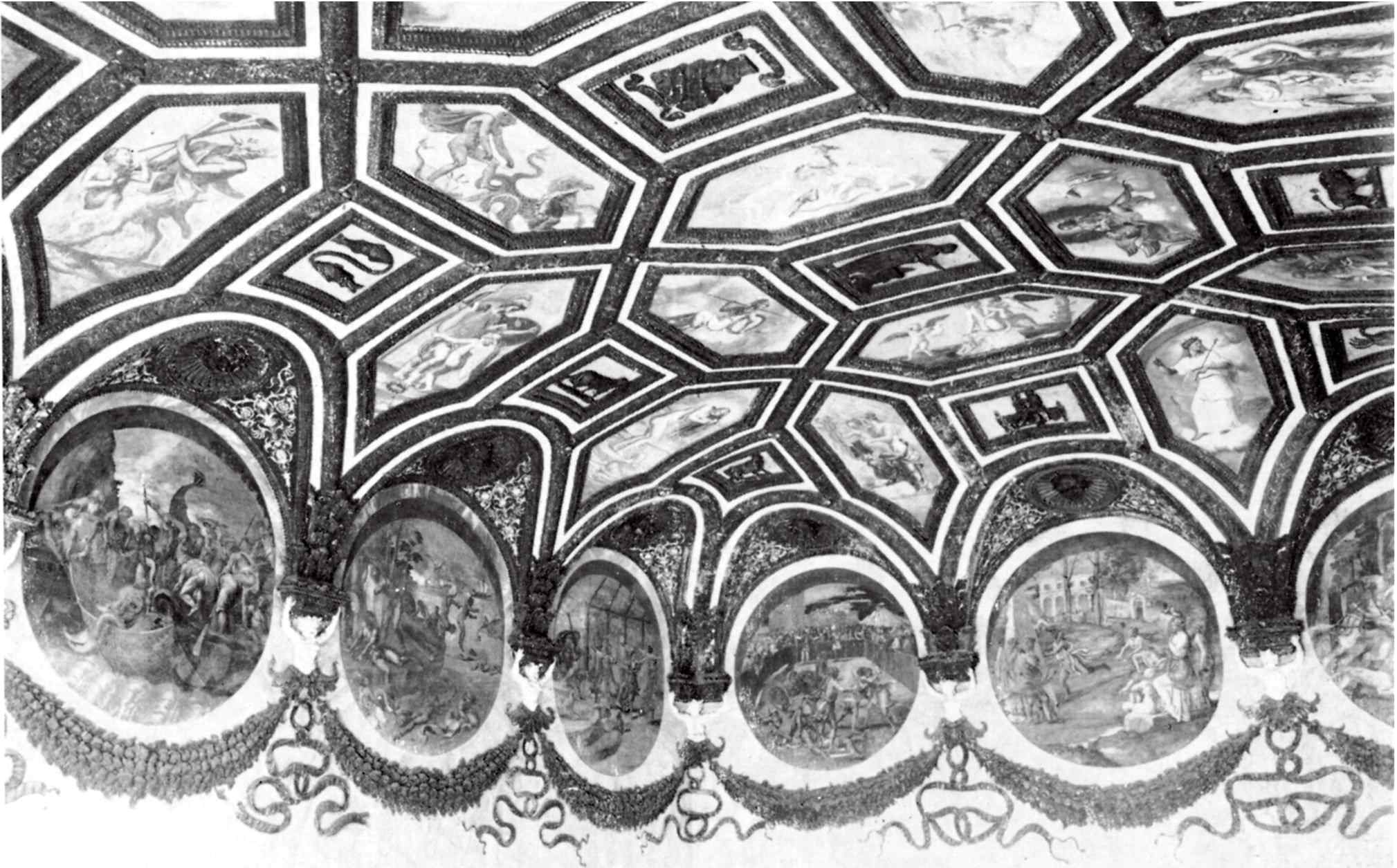 Впрочем, название свое в документах того времени комната получила не от росписи, а от золоченых лепных масок шестнадцати ветров – по одному над каждым медальоном – которые отделяют безбурную небесную сферу от тревожных сцен на земле. Действительно ли шестнадцать ветров[375] – главное в комнате, или эти маски, как и орлы в соседней, были выполнены раньше остального убранства, а имя, появившееся в ранних документах, осталось и после росписи?
