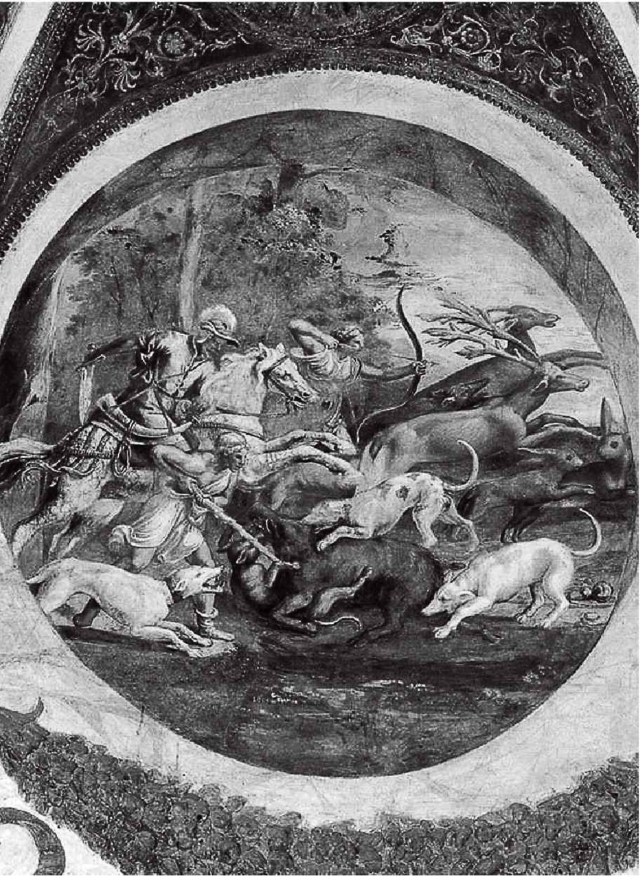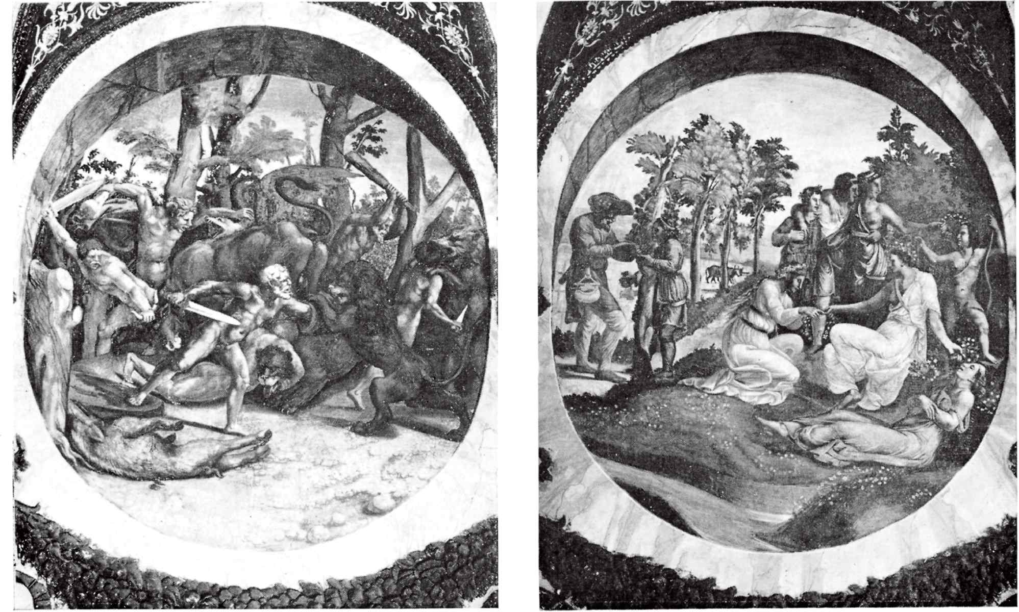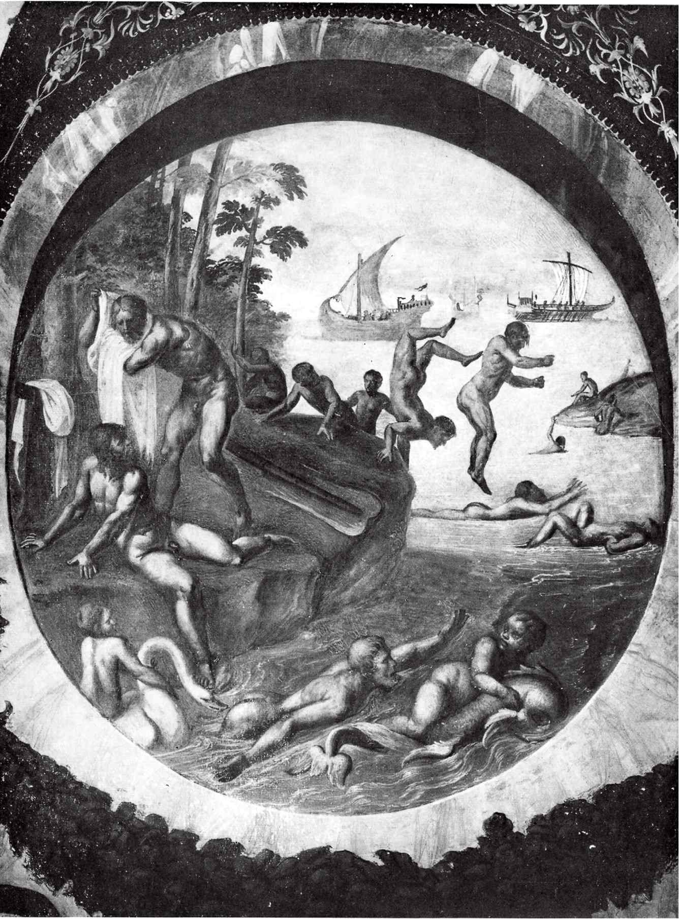 Под конец «Гипнеротомахии» влюбленные оказываются в священной роще Венеры. В ее центре стоит саркофаг, или купель, с мраморным рельефом, запечатлевшим событие, которые случилось на этом самом месте: Венера купалась в беседке из роз и босиком побежала на помощь Адонису, которого преследовал ревнивый Марс. Она наколола ногу на розовый шип, и кровь ее, собранная Купидоном в раковину, превратила розу в тот красный цветок, каким мы знаем ее теперь. Колонна мог взять эту историю из греческого учебника риторики, «Прогимнасты» Афтония, где она приведена как пример краткого и выразительного рассказа.[342] Ксилография с изображением саркофага в издании Альдуса знакома исследователям ренессансной иконографии как вероятный источник одного из рельефов на мраморном бассейне так называемой «Любви Земной и Небесной» Тициана.[343] Однако Тициан не единственный из художников своего времени, кто постарался превратить наивную ксилографию в подлинную классическую идиому: та же сцена украшает одну из стен Салы ди Псиче Джулио Романо в Палаццо дель Тэ. В левой части Венера купается, надо полагать, с Адонисом, хотя его обычно считают Марсом. В правой части Марс преследует Адониса, Венера пытается его удержать. Зная текст, легко догадаться, что Купидон указывается на розу, о которую ей предстоит уколоться. Любопытно, что бы сказал Колонна о таком огрубленном пересказе, сделанном всего через поколение после публикации книги. И все же сама мысль о святилище Венеры, почерпнутая из его аллегорического сочинения, была явно близка тем, кто заказывал роспись Салы ди Псиче.[344]