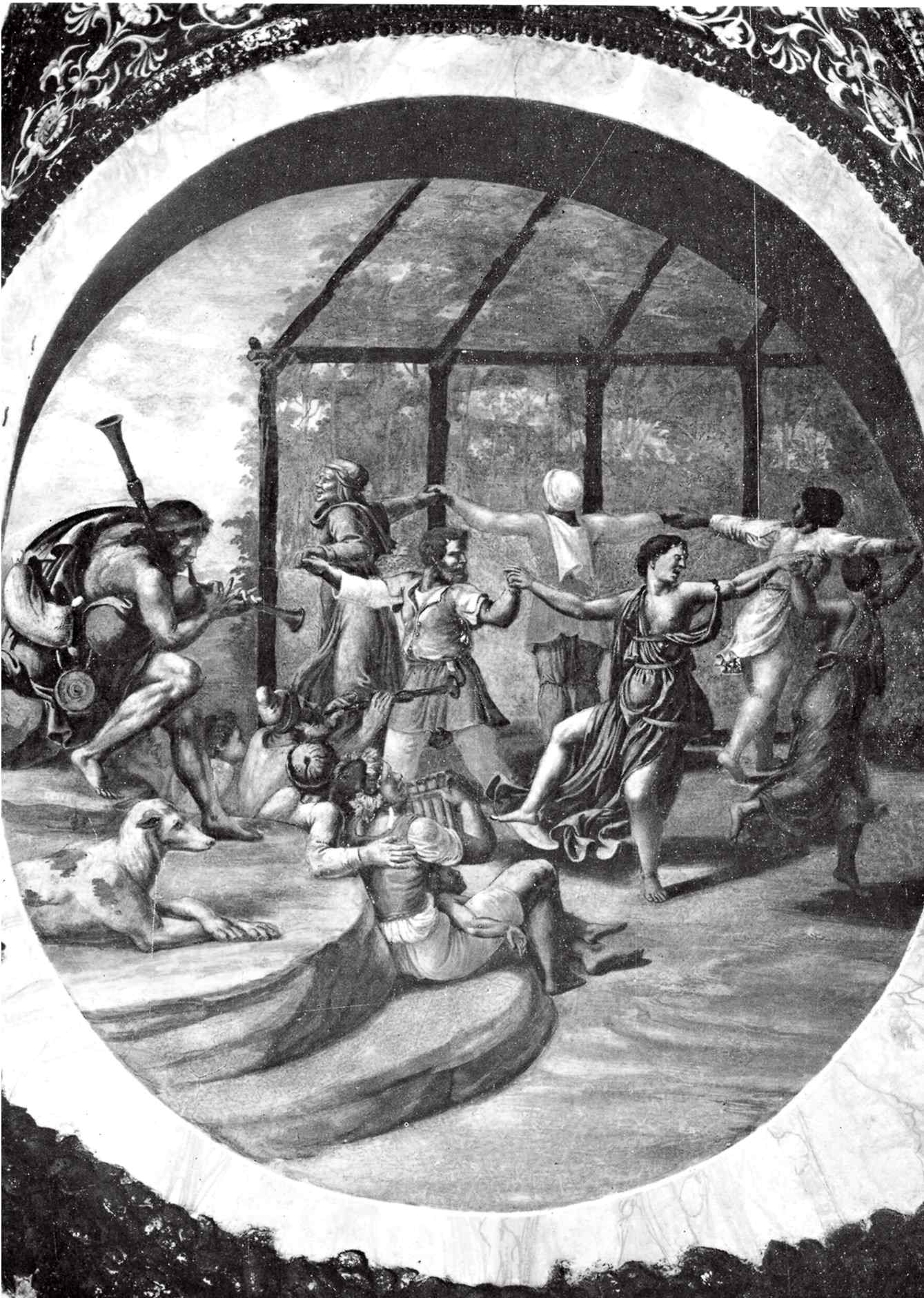 Это отрывок проиллюстрирован в наклонном медальоне под Овном с его тремя играющими на дудочках пастухами – Джулио облагородил «развратность» влюбленных пар, изящно совместив элементы all’antica с современною пасторалью.[353]
