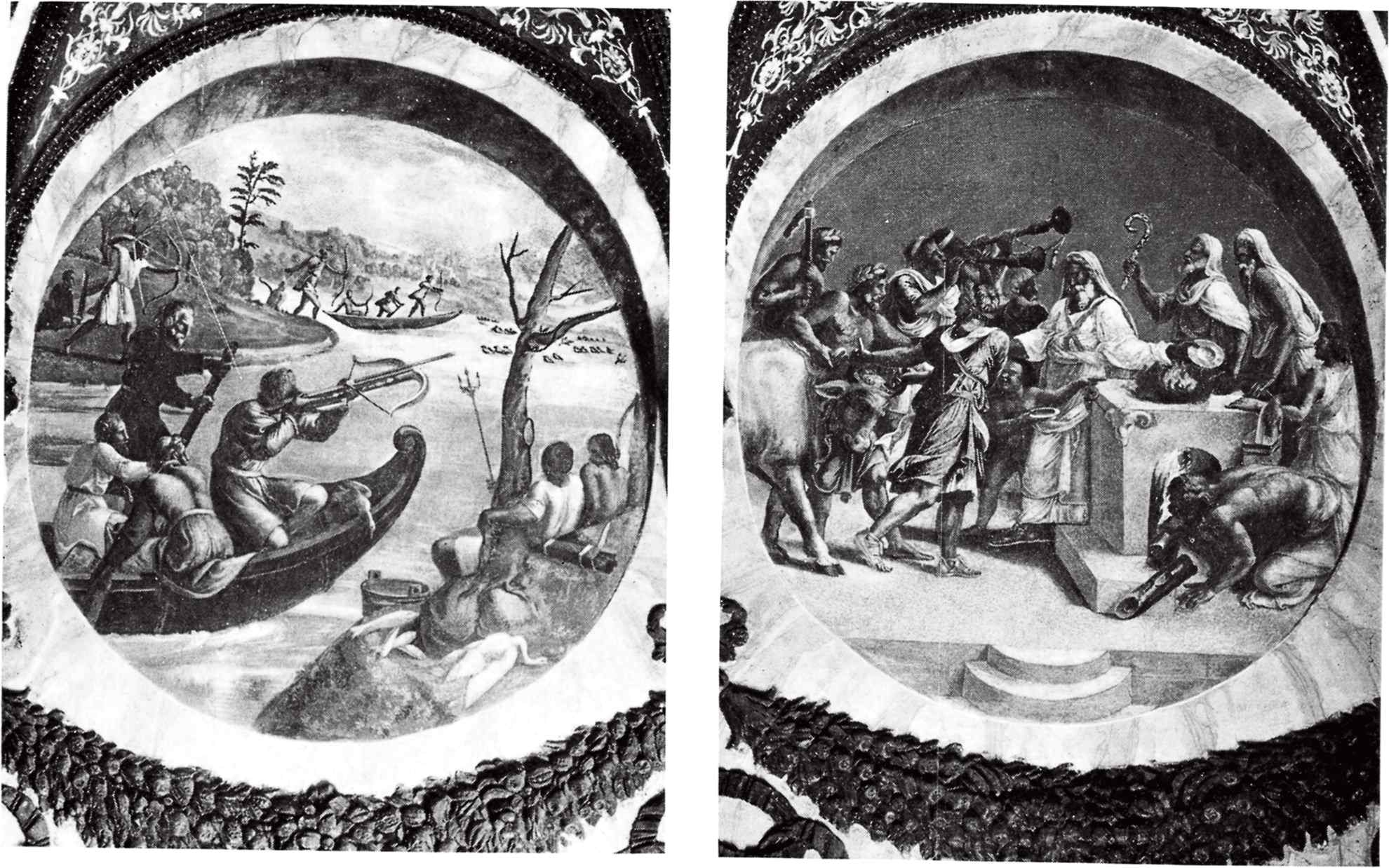Кто бы ни сочинял программу для этой комнаты, ему вполне удалось создать атмосферу мистической таинственности[360] – хотя использованный метод не вполне нов. Во всяком случает, поворот от «вульгарной» планетарной астрономии к более «эзотерической» мудрости Манилия предвосхищен в знаменитом астрологическом цикле Феррары, города, из которого ведет род сиятельнейшая матушка Федериго.[361] В обоих циклах планеты, обычно изображаемые совместно с зодиакальными знаками, заменены двенадцатью олимпийцами, каждому из которых, по Манилию, поставлен в соответствие знак.[362] При взгляде на потолок Салы деи Венти видно, что и здесь, как в Ферраре, сохранена приведенная у Манилия последовательность, хотя сопоставление с зодиаком и нарушено из-за необходимости вместить изображения в имеющееся пространство.[363]