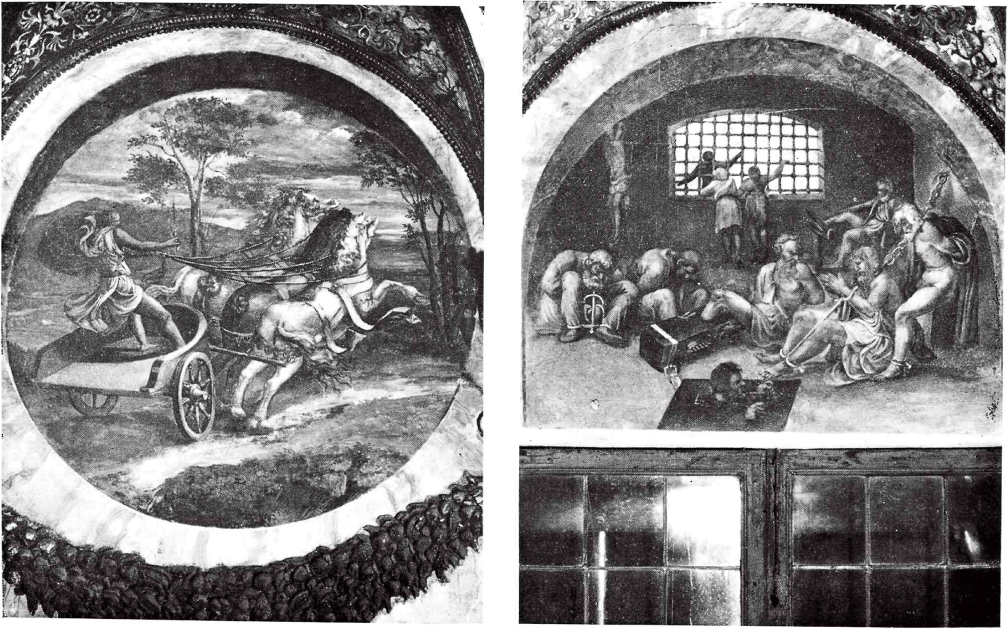 Порядок иллюстраций изменен. Тюремная сцена в центре, под Стрельцом изображает несчастных, в чьем гороскопе Арктур садился. Соседний медальон – стражей царских домов. Одна из радостей успешной интерпретации в том, что можно увидеть подробности, которых иначе, скорее всего, не разглядишь. «Царский дом» на медальоне обычно считали видом на исчезнувший сад перед Палаццо дель Тэ.[355] Теперь оснований для этого меньше. Это может быть любой, придуманный Джулио дворец, главное же здесь – фигуры стражей по обе стороны входа.
