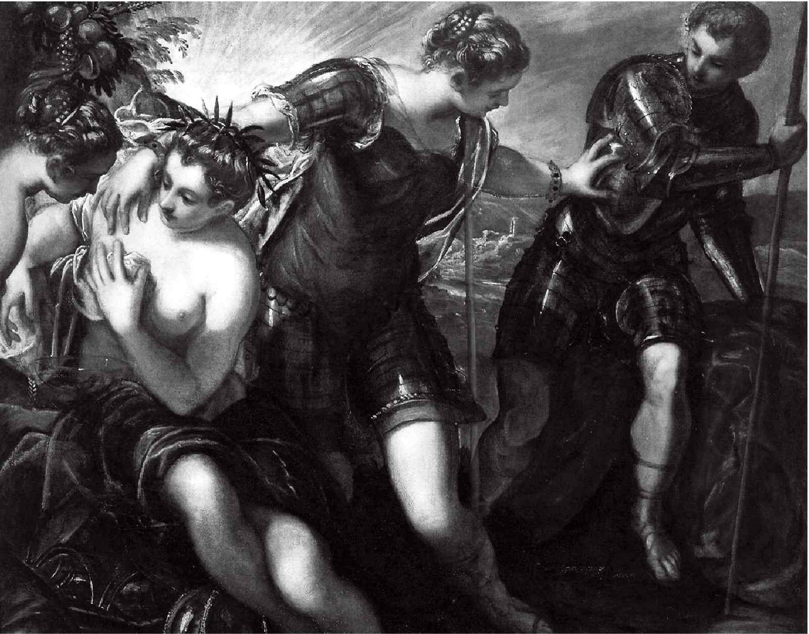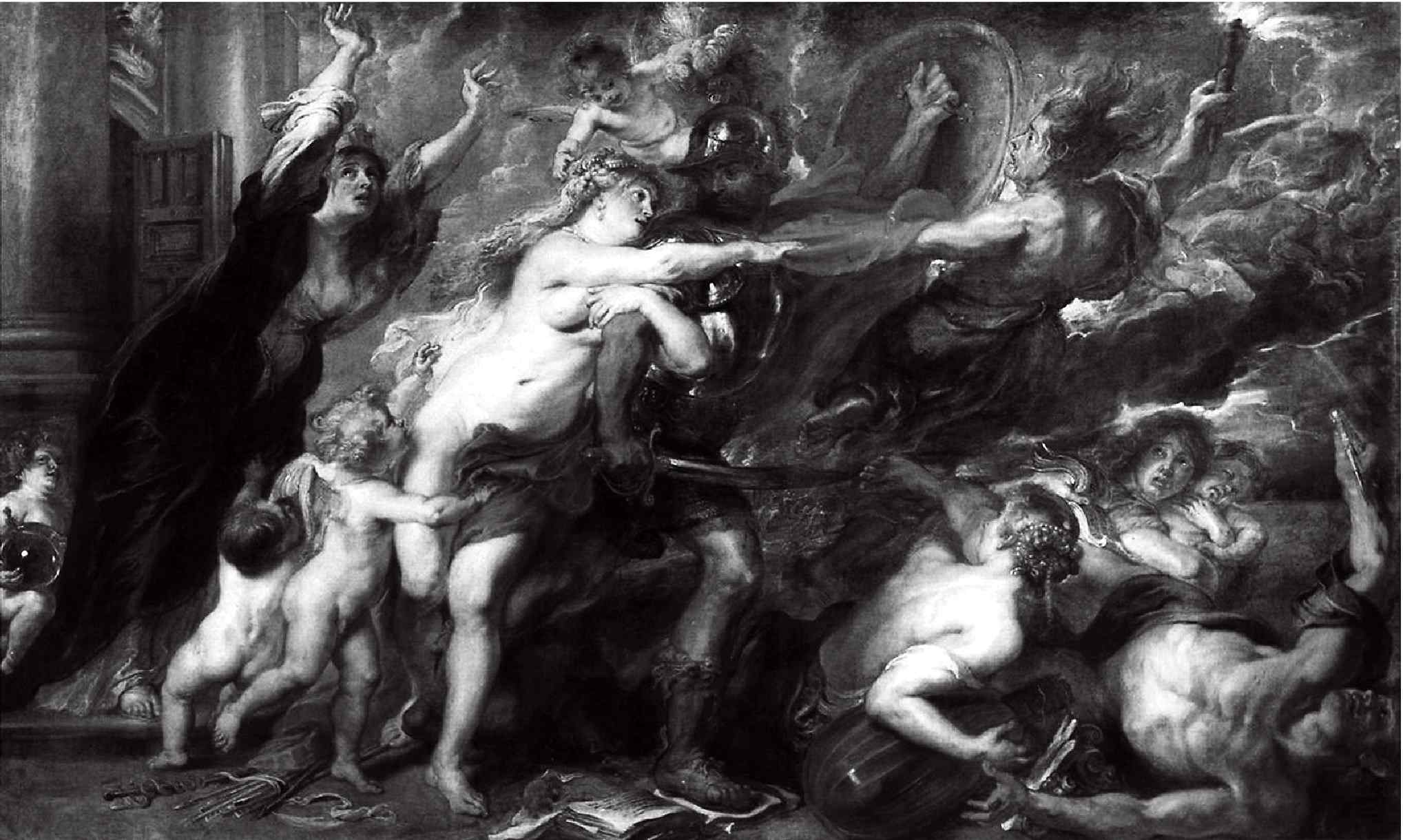 Как-никак, главные персонажи – обитатели древнего Олимпа, богиня любви Венера и бог войны Марс. Может быть, перед нами иллюстрация, на которой, как и на многих других, вымышленные существа, некогда почитавшиеся реальными, представлены в своем воображаемом облике? Однако мы знаем, что даже в античности не было подлинного различия между собственно богами и ими же в качестве олицетворений или метафор. Купидон – не только божество любви, он еще и любовь, как Минерва – мудрость. Композиция Рубенса и впрямь напоминает такое символическое представление богов. Тот же Лукреций, что пропагандировал эпикурейский атомизм как лекарство от страха перед богами, начинает поэму с призыва к Венере – воплощению плодородия – заманить в свои объятия Марса и, таким образом, подарить Риму желанный мир. Рубенсу оставалось лишь чуть повернуть этот образ другой стороной и показать Марса, который, не желая покоряться Венере, сеет среди народов ужасы войны. Тут он, разумеется, опирался на язык аллегорических композиций, давно развивавшихся в контексте политических фарсов и живописи. Так, в 1578 году, за шестьдесят лет до Рубенса, Тинторетто выразил сходную мысль в картине для герцогского дворца в Венеции. Здесь Минерва не пускает Марса к двум персонификациям, которых Ридольфи называет Миром и Изобилием.[413]