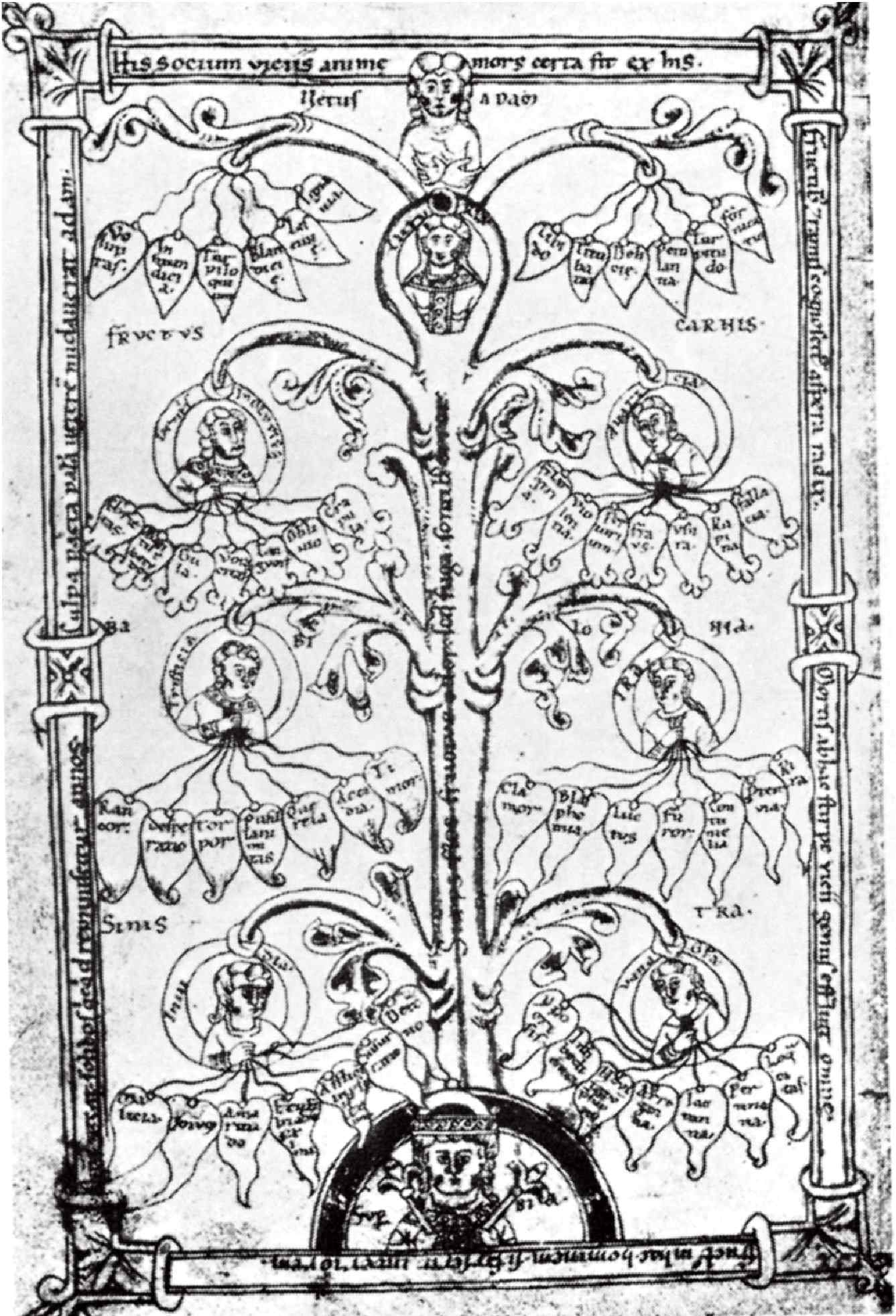 Любовь к системе, свойственная средневековой дидактике, породила целые генеалогические деревья, иллюстрирующие взаимосвязь логических понятий. В «Древе» пороков гордыня – корень всякого зла, соответствующий же набор добродетелей произрастает из смирения.[418] Подобные иллюстрации ближе всего к дидактической схеме, персонификации здесь полностью подчинены идее, их легко можно заменить надписями.