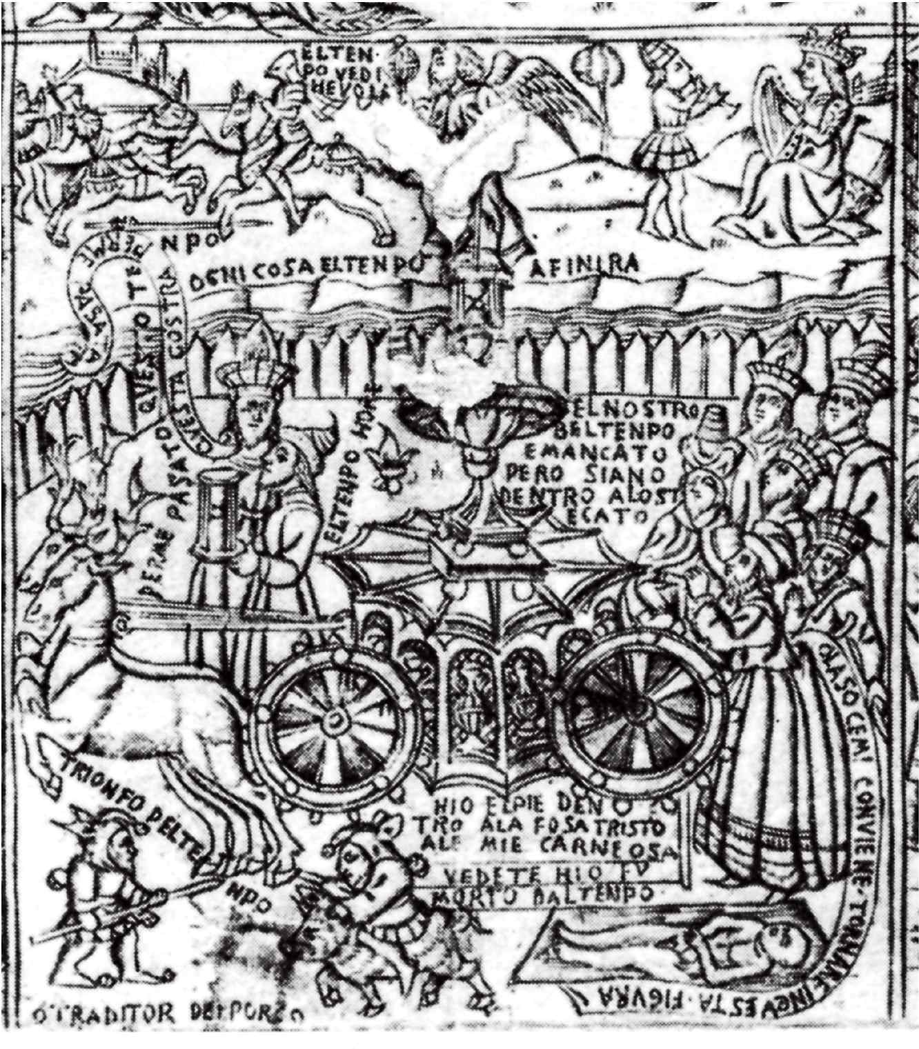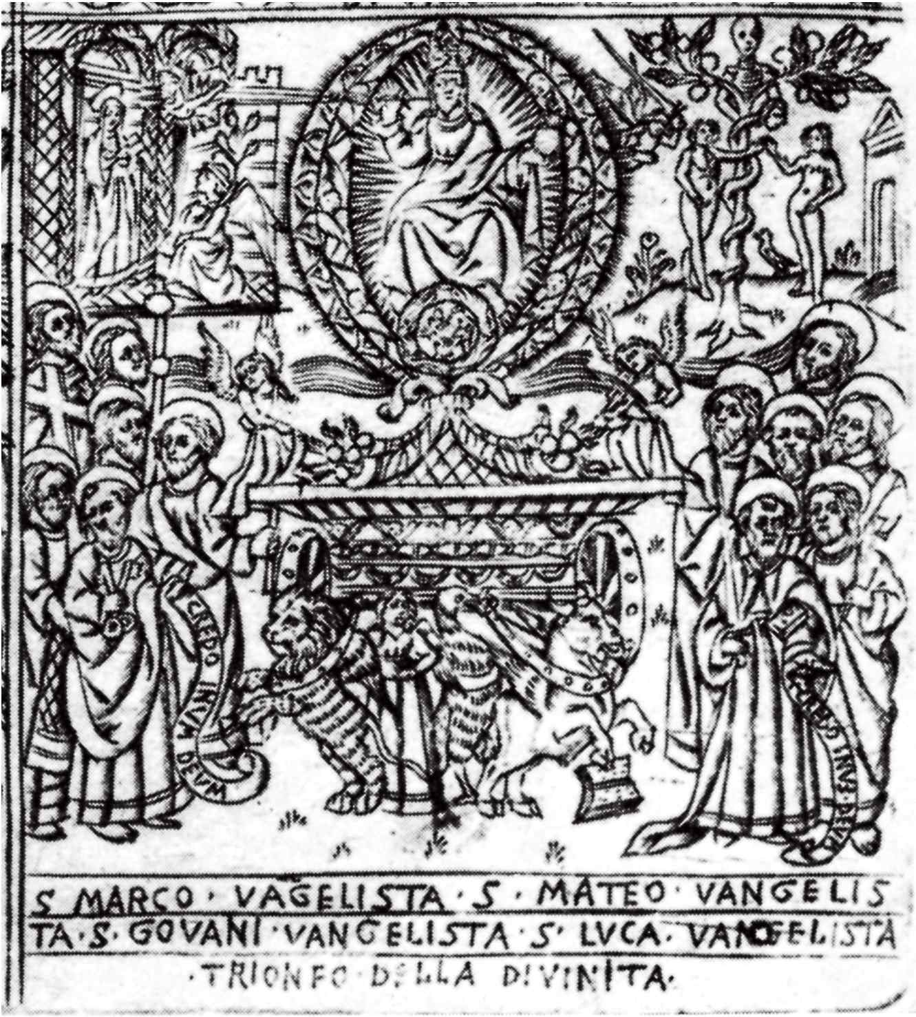 Шесть побед Петрарки (Любовь, Целомудрие, Смерть, Слава, Время, Божественность). Флорентийская гравюра 15-го века. Лондон, Британский музей