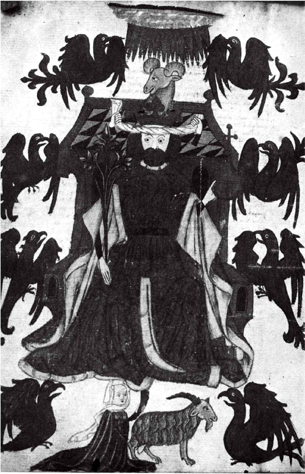 Крайне мало вероятно, чтобы Ридволл хотел увидеть воплощенной свою картину.[433] Известна лишь одна такая попытка, причем относительно поздняя, в весьма посредственно иллюстрированном немецком манускрипте пятнадцатого века. И все же едва ли случайно, что Ридволл и его более влиятельный последователь Роберт Холкот любили этот прием – вымышленные описания. Причина уже упоминалась вскользь: она – в «искусстве запоминания», которое блестяще разбирает Фрэнсис Йейтс.[434] Метод этот, применявшийся в риторических школах и среди проповедников, состоял в том, чтобы составить мысленный образ, достаточно яркий и запоминающийся. Образ этот размещался на раз и навсегда заданном каркасе, предпочтительно – на знакомом сооружении. Фигура с головой овна, окруженная орлами – как раз такой образ, который должен впечататься в память и помочь в длинной проповеди, не сбиваясь, перечислить все качества Благожелательности. Нет нужды рисовать саму картину, главное, чтобы ее можно было удержать в памяти.