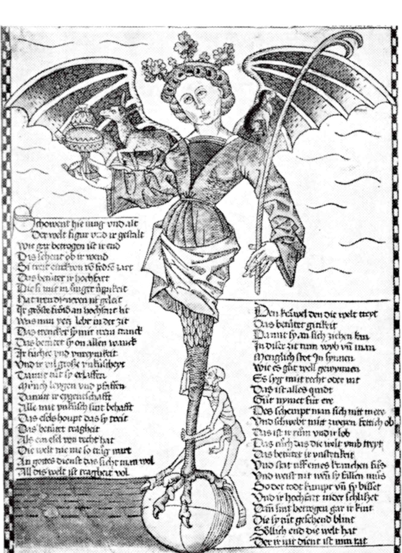 В этой фигуре удивительна ее передовая оснащенность. Хотя иллюстрируемые представления, как показала Розамунда Тьюв, насчитывают много столетий, сами атрибуты исключительно новы. Часы, очки, ветряные мельницы – изобретения позднего Средневековья, и даже шпоры были неизвестны древнему миру.