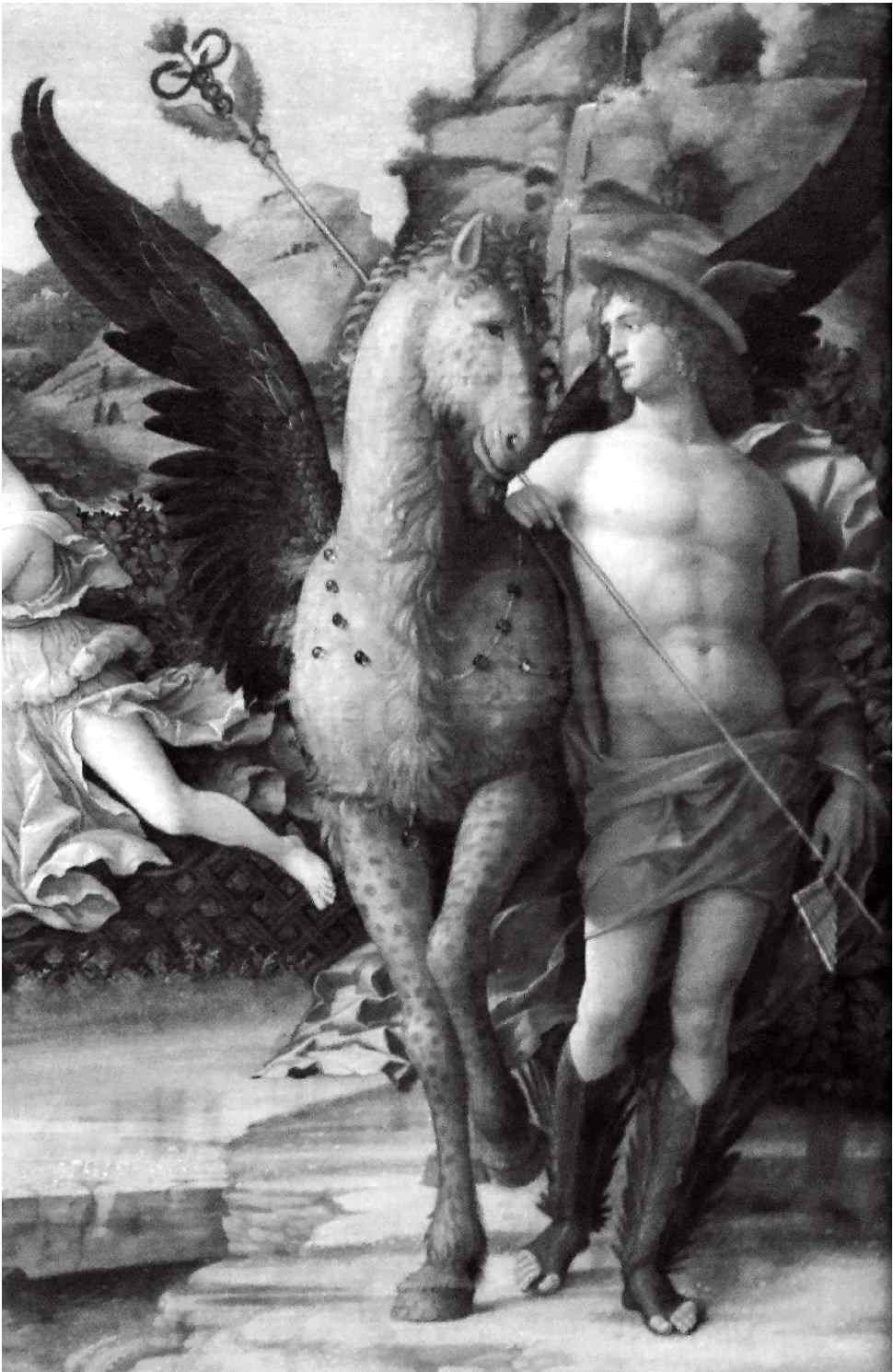 Зачем, коли так, в картине Гермес с Пегасом? У Гомера перешучивание Гермеса и Аполлона (оба соглашаются, что охотно поменялись бы с Ареем местами) как раз и вызывает хохот богов. Одновременно, если Гермес связан с даром красноречия и искусствами, его присутствие равно подходит к рождению Гармонии.