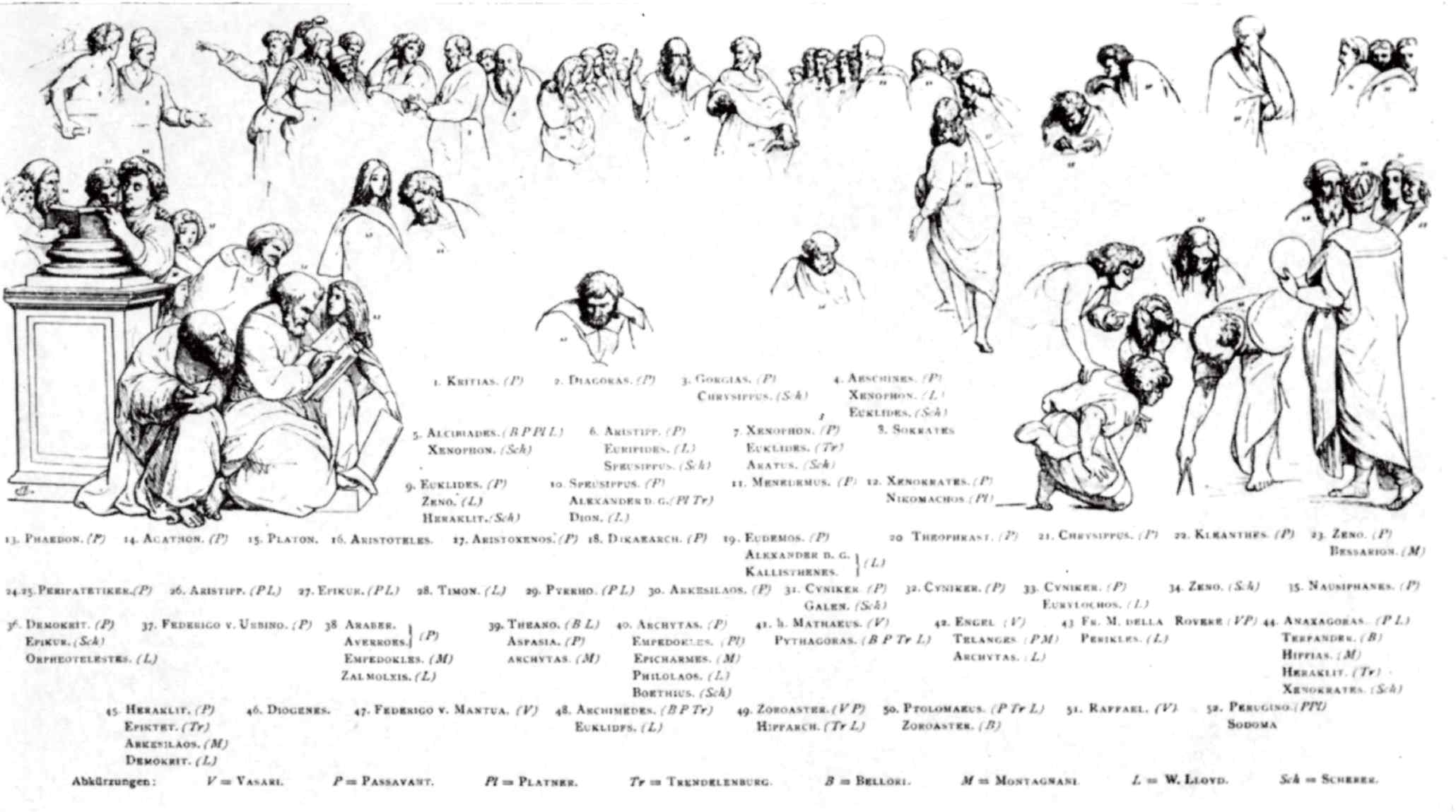 Сопоставление различных «идентификаций» «Афинской школы». Anton Springer, «Raffael’s Schule von Athen», – Die graphischen Kunste, Bd. V. 1883