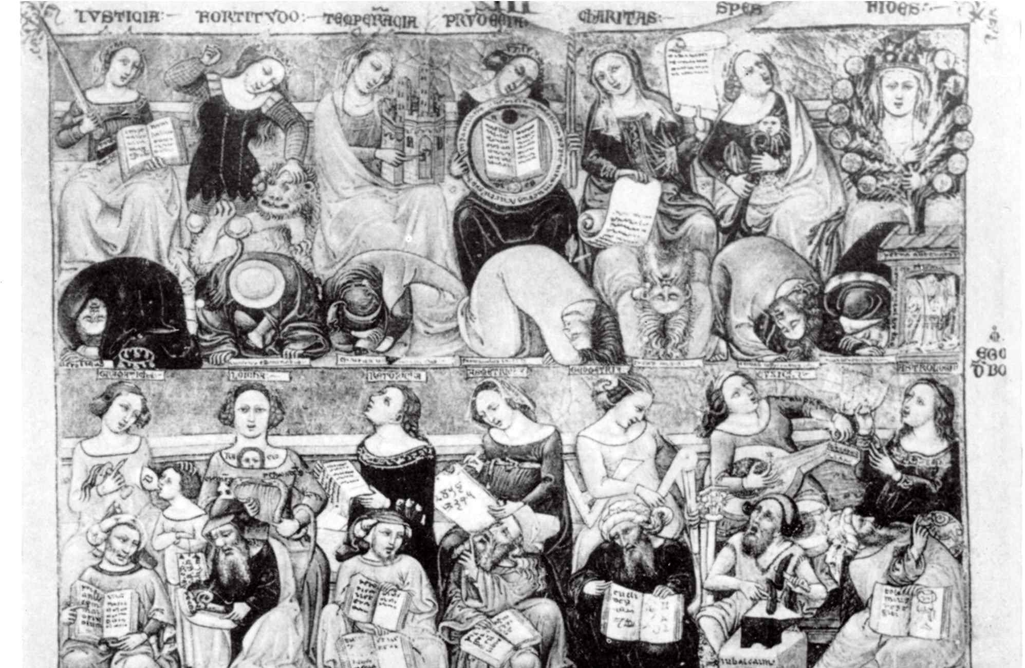 Николо да Болонья: Добродетели и Искусства, из «Novella super libros Decretalium» Джованни Андреа, 1355, Милан, Амброзиана, MS. B. 42 inf., fol. I