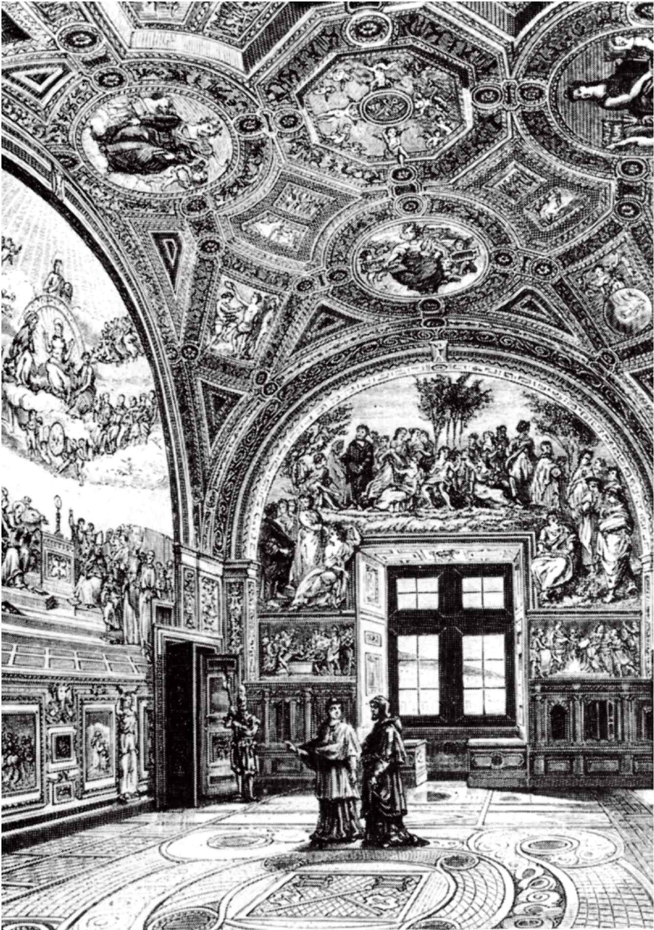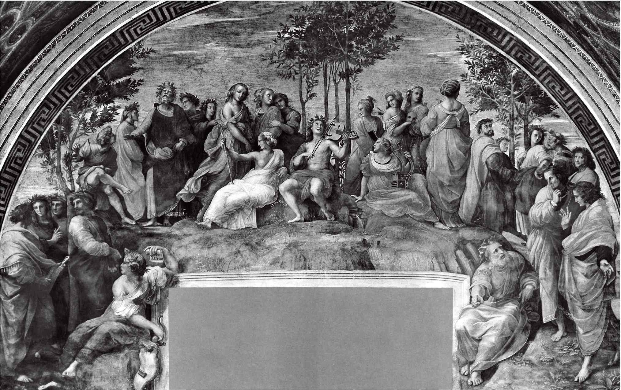 Цикл Станцы делла Сеньятура организован так, что рассматривать его надо, начиная с потолка, но помещение очень мало, и на фотографии невозможно запечатлеть одновременно стену и часть свода. Поэтому, чтобы передать хотя бы основной план, мы вынуждены воспользоваться плохонькими гравюрами девятнадцатого века. На своде изображены четыре сидящие на троне аллегорические фигуры, а под ними, «на земле», группы людей. Например, под персонификацией Поэзии расположена фреска, которую обычно называют «Парнас» с Аполлоном, музами, поэтами и поэтессами – ближайшая к нам держит свиток, из которого явствует, что это – Сафо.
