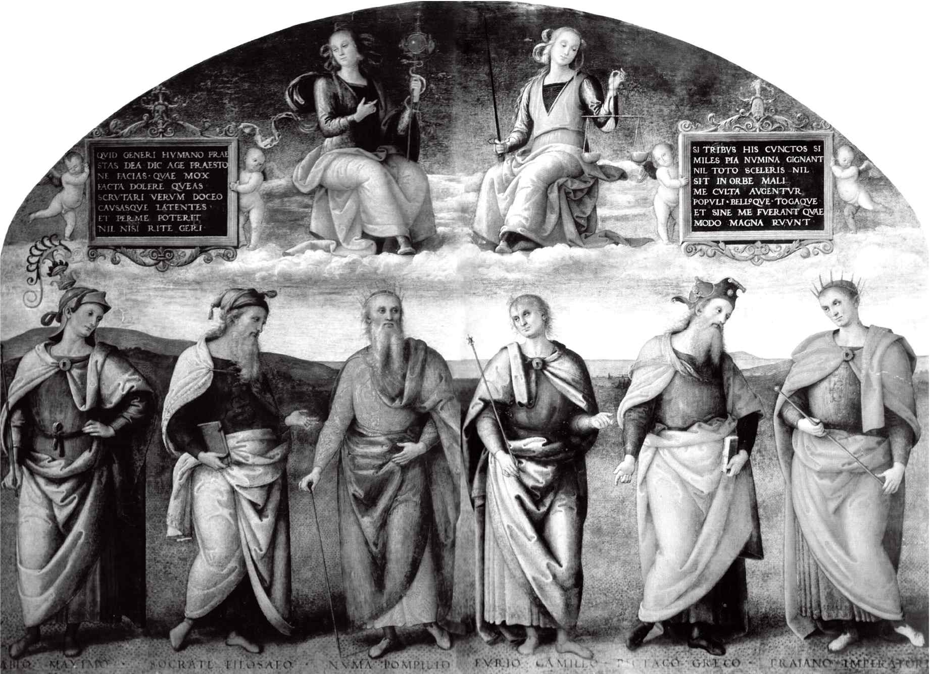 Так случилось, что эта традиция – изображать персонифицированные добродетели вместе с их историческими образцами – нашла отражение в прославленном цикле фресок, известном, вероятно, и Рафаэлю, и Юлию II. Перуджино начал «Камбьо» в Перудже на рубеже веков, в то самое время, когда Рафаэль был ближе всего к учителю, и закончил примерно в 1507 году, за какой-то год до того, как оба художника уехали в Рим расписывать папские покои.[284]