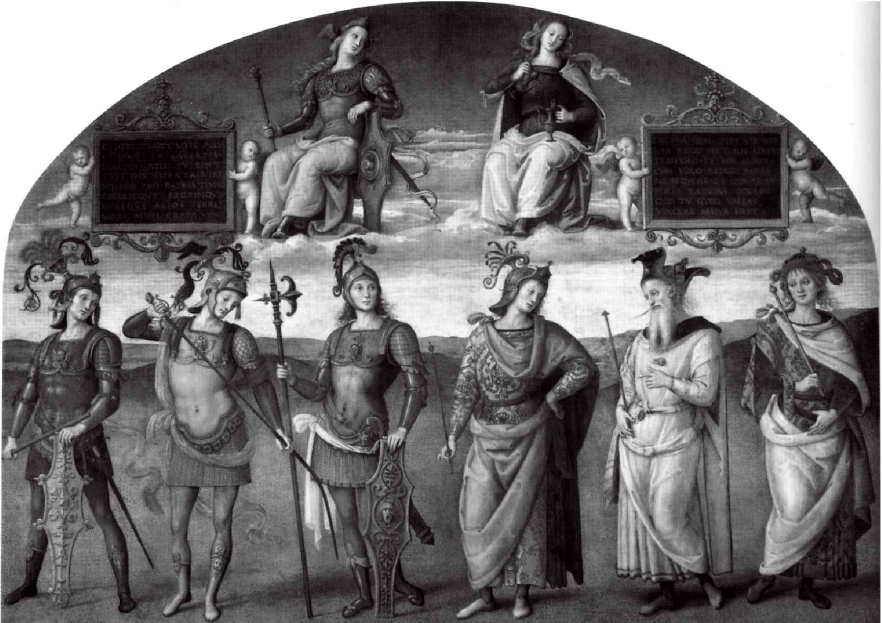 Перуджино: Стойкость (с Л. Сицинием, Леонидом и Горацием Коклесом), Умеренность (с Л. Сципионом, Периклом и Цинциннатом). Камбьо, Перуджа