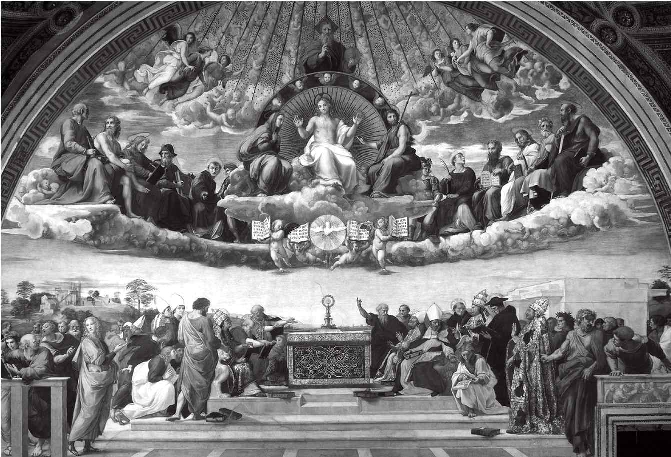 Название это пошло от Вазари – он говорит о святых, спорящих о святых дарах на алтаре.[286] Часто указывалось, что это объяснение (которое Вазари в эпоху Реформации казалось вполне естественным) только замутняет смысл композиции. Ее, как и остальные, надо читать сверху вниз, от Бога к человеку. В этом всеохватывающем контексте мы видим, как «знание вещей божественных» снисходит на землю в Боговоплощении. В этом необычном изображении Троицы голубь Святого Духа спустился ниже фигуры Христа и, в окружении четырех Евангелий, парит над алтарем, вокруг которого отцы Церкви в своих боговдохновенных писаниях разъясняют человечеству благую весть.