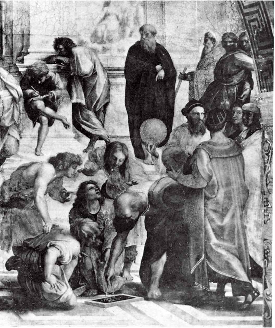 Являются ли они еще и примерами Семи Свободных Искусств, как у Пинтуриккьо? Предположение Шпрингера выглядит заманчиво:[288] действительно, легко предположить Геометрию в группе вокруг человека с циркулем, Музыку – в симметричной ей группе вокруг таблички с музыкальными гармониями; Астрономия без труда угадывается в царе со сферой – традиционном изображении Птолемея (астронома путали с правителем). Но уже Арифметику, четвертую в квадривиуме, найти не так просто, когда же дело доходит до тривиума – Грамматики, Риторики и Диалектики – выбор становится еще более произвольным. Кроме того, можно вполне законно усомниться, а входит ли вообще тривиум в понятие causarum cognitio. Куда правдоподобнее, что люди, собравшиеся вокруг Сократа, погружены в нравственную философию, основателем которой он почитался, а те, что напоминают квадривиум– в натурфилософию или науку?