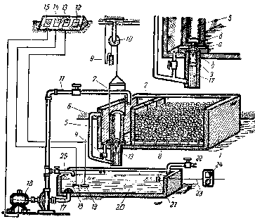 1 – резервуар с субстратом; 2 – отделительная стенка; 3 – спуск раствора; 4 – сливной кран; 5 – запирающий стакан; 6 – аварийный сброс; 7 – отводная трубка; 8 – дренажная трубка; 9 – противовес; 10 – блок; 11 – подающая труба; 12 – терморегулятор (температура воздуха в помещении); 13 – терморегулятор (температура раствора); 15 – часовой включающий механизм; 16 – насосный агрегат; 17 – фильтры; 18 – электроды; 19 – кабель для подогрева раствора; 20 – бассейн с раствором; 21 – поплавок; 22 водопроводная вода; 23 – сеть аварийного сигнала; 24 – аварийный сигнал; 25 – перепускная труба: а – уплотняющее кольцо; б – направляющие; в – отверстие в дне стакана.