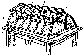 Рис. 37. Гидропонная установка в миниатюрной тепличке: 1 – субстрат; 2 – терморегулятор; 3 – кабель обогрева; 4 – петли; 5 – откидная фрамуга для облегчения работы и для вентилирования; 6 – светящиеся трубки; 7 – включение освещения.
