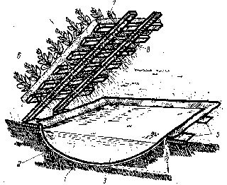 Поэтому мы укладываем рядом друг с другом нужное число реек или планок длиной 2 м и шириной примерно 5 см на расстоянии 5 см одну от другой и прибиваем к ним три поперечные рейки шириной 10-12 см для придания жесткости конструкции. Решетка должна полностью закрывать весь резервуар. Поперечные рейки, несущие всю тяжесть и опирающиеся на края выемки, должны несколько выступать, чтобы нагрузка не приходилась на самый край выемки. Лучше всего под опорные концы длинных реек подложить кирпичи, заглубив их в почву. Этим предотвращено повреждение краев пленки и достигнута максимальная стабильность сооружения.