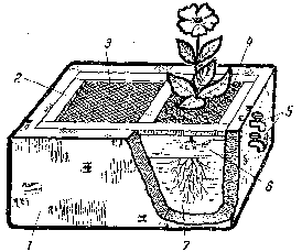 Рис. 40. Разрез гидропонной установки: 1 – бетонное корыто; 2 – рама из планок; 3 – проволочная сетка; 4 – слой субстрата (мох); 5 – краны для регулирования уровня раствора; 6 – «влажная зона»; 7 – питательный раствор.