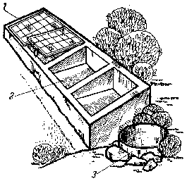 Рис. 42. Бетонированные выгоночные гряды для водной культуры в саду:1 – выгоночные грядки; 2 – питательный раствор; 3 – бочка для сливания раствора.