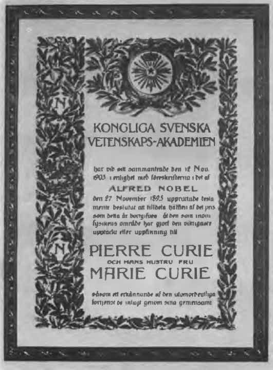 Диплом лауреатов Нобелевской премии, врученный Пьеру и Мари Кюри