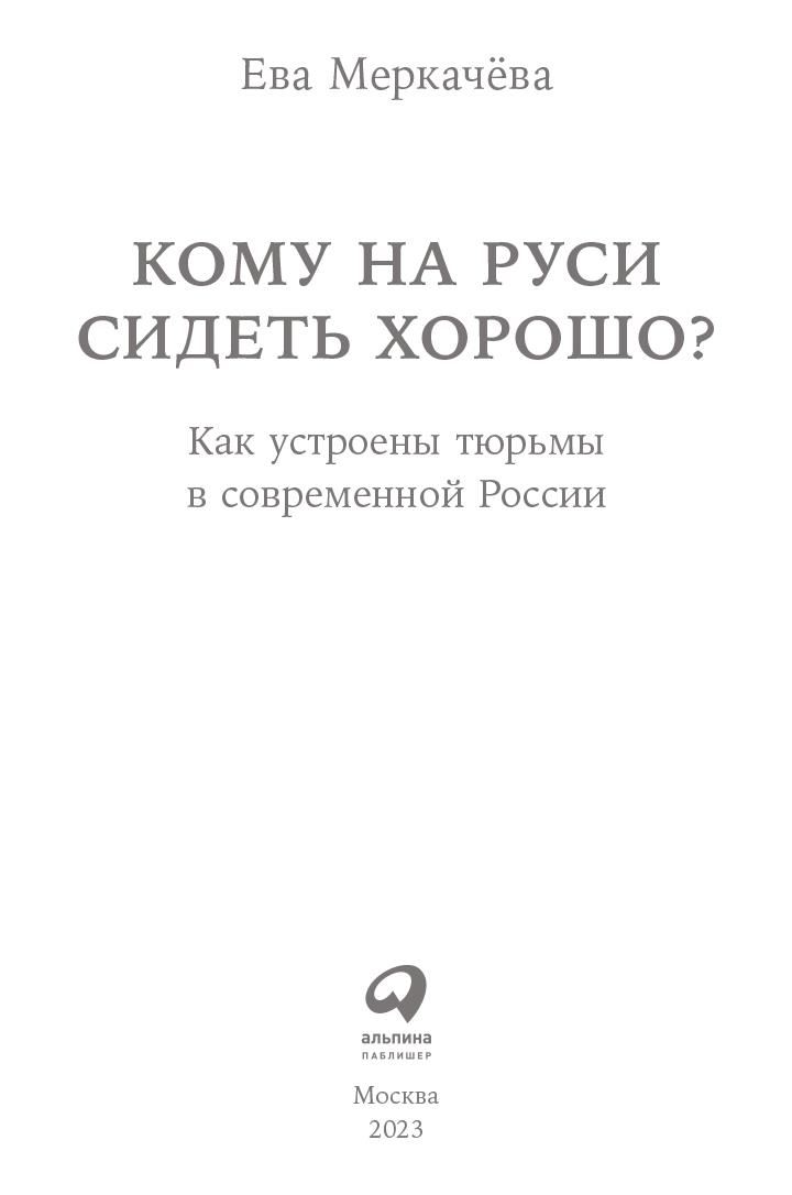 Книга «Кому на Руси сидеть хорошо? Как устроены тюрьмы в современной России» – новая работа известной российской журналистки (титулованной за очерки в газете «Московский комсомолец» званием «Золотое перо России»), активного правозащитника, члена Общественной наблюдательной комиссии (ОНК) города Москвы, члена Совета при Президенте РФ по развитию гражданского общества и правам человека Евы Меркачёвой. Книга родилась на основе публикаций автора в ее родной газете. Недавно из печати почти одновременно вышли две ее книги – «Град обреченных»[3]3