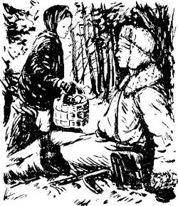 И погибнуть бы так Андрею Ивановичу, но из ближней деревни, занятой врагами, в лес за хворостом пришла девочка. Это и была Фрося. Она увидела раненого и помогла ему. На другой день под видом того, что идет за хворостом, она опять пришла, накормила его и перевязала рану. Потом снова приходила и так спасла его.