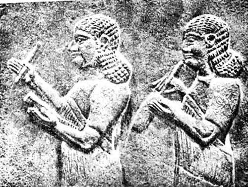 Первый чиновник держит в руках палочку для писания клинописью, второй пишет арамейским шрифтом при помощи пера на папирусе. 1-я половина IX в. до н. э. (Гипсовая копия в Переднеазиатском музее. Берлин.)