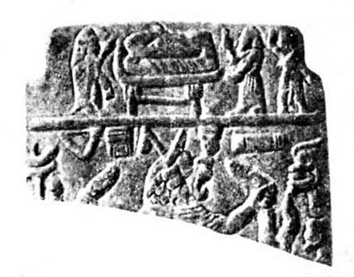 На высоком ложе лежит больной, над которым произносят заклинания два жреца; левый наряжен рыбой. 1-я половина I тысячелетия до н. э. Высота 4,9 см