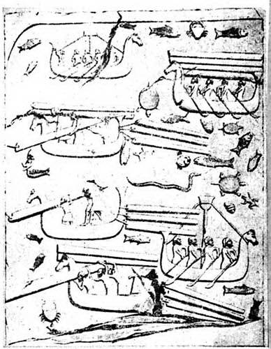 На ассирийском рельефе весьма наглядно изображены корабли и перевозка строительного леса. В волнах Средиземного моря резвятся разнообразные морские животные и сказочные существа. VIII в. до н. э. Высота 2,83 м