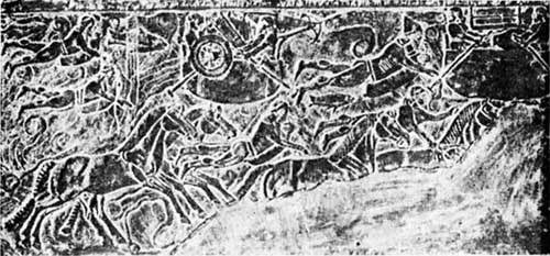 На рельефе из Нимруда изображена переправа через реку. Воины плывут на наполненных воздухом мешках из бараньей кожи. Оружие и снаряжение перевозят на лодках, которые ныне называются гуффы. I-я половина IX в. до н. э. Высота 0,98 м, ширина 2,18 м. (Гипсовая копия в Переднеазиатском музее. Берлин.)