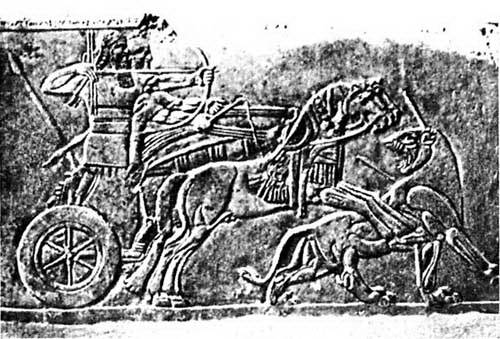 На алебастровом рельефе, на котором изображен ассирийский царь Ашшурбанапал, можно ясно увидеть упряжь, конструкцию и арматуру легкой колесницы. 1-я половина IX в. до н. э. Высота 0,97 м, ширина 1,83 м