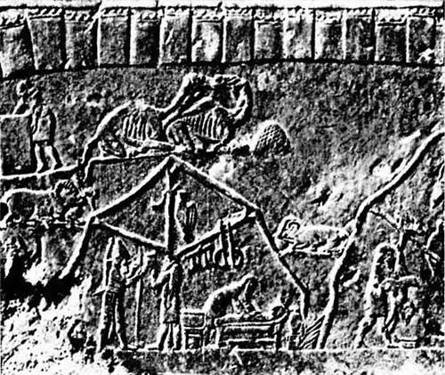 При штурме осажденных городов часто применялись стенобитные орудия. 1-я половина IX в. до н. э. Высота 0,89 м. (Гипсовая копия в Переднеазиатском музее. Берлин.)