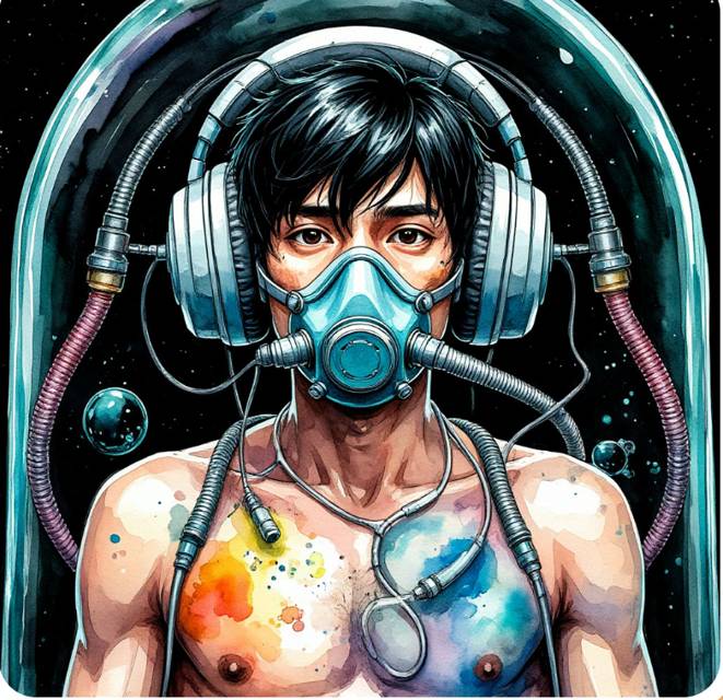 Худощавый, черноволосый, бледный и небритый парень лежал там, подключенный к системе жизнеобеспечения. На лице у него я увидел пластиковую маску, через катетеры по трубкам прямо в вены поступала некая янтарного цвета субстанция, на груди виднелись какие-то присоски и датчики. Нижняя часть его тела была скрыта под непрозрачной частью крышки.