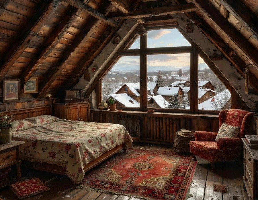 На самый верх вела деревянная лестница, которая заканчивалась изящными перилами с резными балясинами. Из прямоугольного окошка тусклый свет очерчивал контуры скошенных под острым углом стен, которые словно распирали деревянные балки, на темно-красном коврике с геометрическим орнаментом – большая кровать с двумя пухлыми подушками, заботливо укрытая пледом, на тумбочке —допотопная лампа под бежевым абажуром, на стенах несколько акварельных рисунков, на столике – вазочки с сухоцветами. Здесь было тепло, приятно пахло старым деревом.