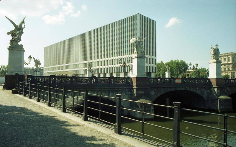 Мы сразу свернули на другую улицу с Карл-Маркс-аллее, и судя по тому, что впереди я увидел роскошное старинное здание, отделанное красным кирпичом – Красную ратушу, ехали мы по Грунерштрассе, свернув как раз на Раутхаусштрассе, где это старинное сооружение и находилось. Проехали по широкому мосту, выехав на Дворцовую площадь, где справа остался массивный параллелепипед Дворца республики. И когда подъехали к очередному мосту через Шпрее, я уже увидел это здание МИД ГДР, белого цвета с фасадом, разделённым алюминиевыми планками на вертикали.