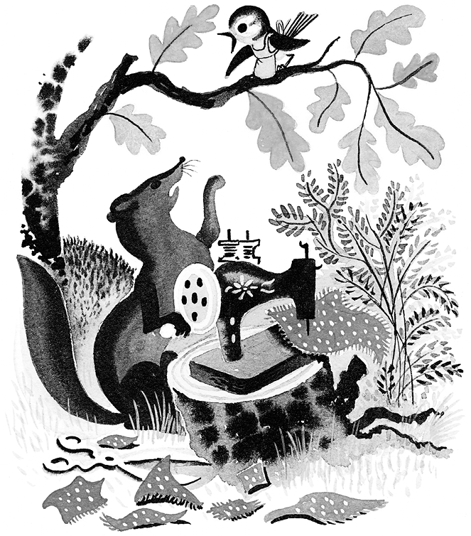 – Да что ты, да что ты! – успокаивает она его, а сама к заячьей шубке приглядывается, с молодым Бурундуком весёлые разговоры заводит, о здоровье у старого Барсука спрашивает.